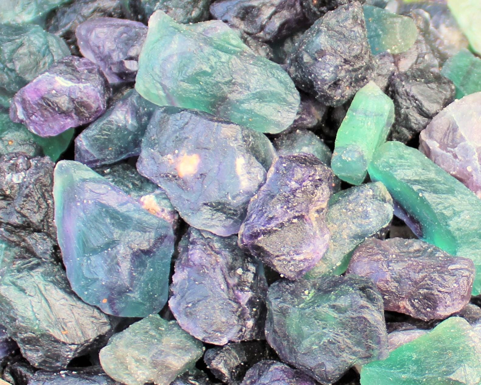 Premium Grade Large Natural Rough Fluorite Crystals, size between about 1" to 2". High quality specimens from China. This is some of the highest quality Fluorite we have ever carried or even seen. Deep purple and green saturation in these translucent crystals give them a spectacular uniqueness. Perfect for decoration or jewelry making among many other things!