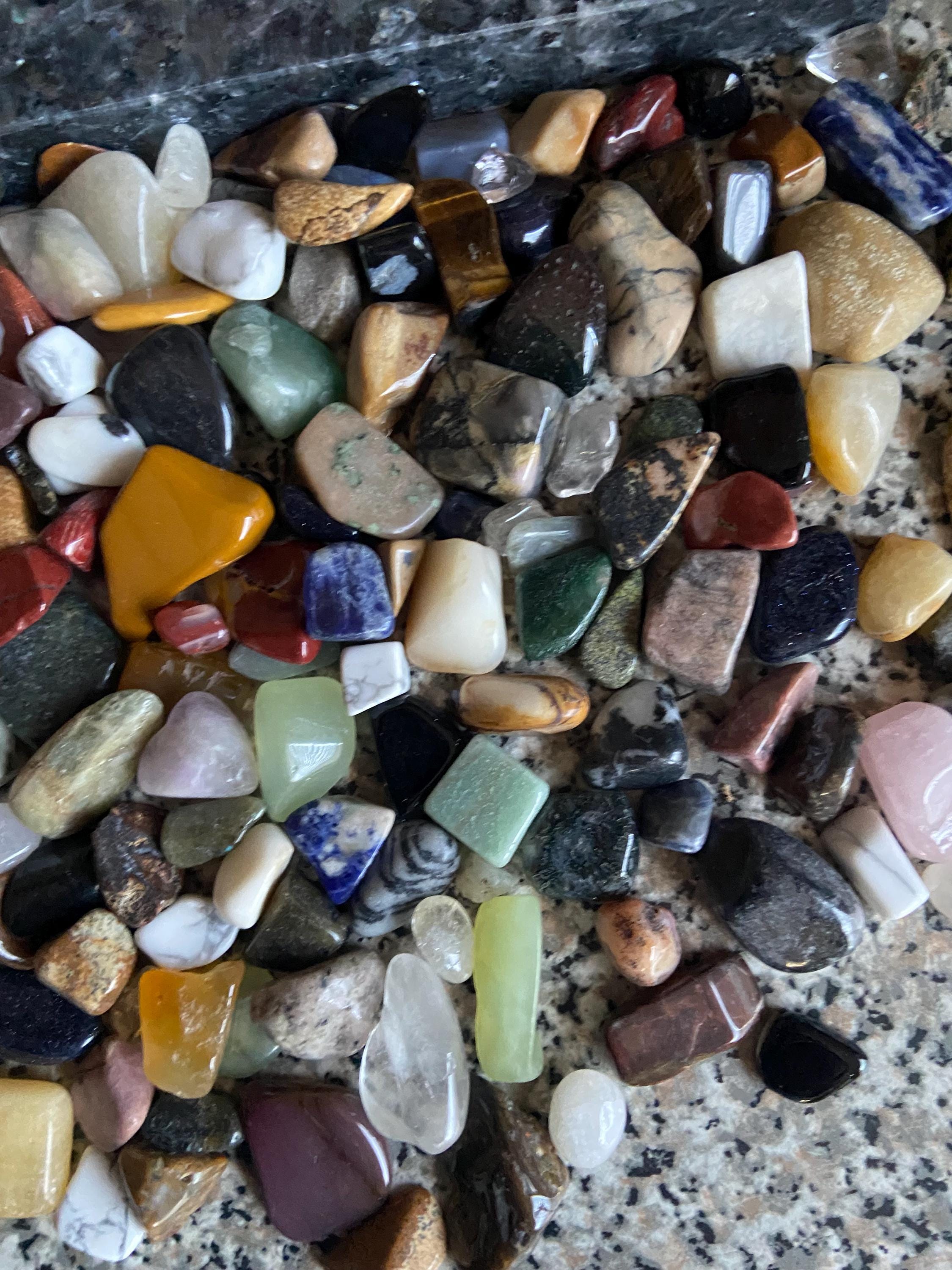 Amazonite, Amethyst, Angelite, Aventurine, Apatite, Aquamarine, Black Agate, Black Obsidian, Black Tourmaline, Black Onyx, Bloodstone, Blue Aragonite, Blue Calcite, Blue Goldstone, Blue Lace Agate, Blue Quartz, Botswana Grey, Breccicated Jasper, Carnelian, Chrysoprase, Citrine, Clear Quartz, Crazy Lace Agate, Dalmatian Jasper, Dumortierite, Emerald, Fire Agate, Fluorite, Garnet, Hematite, Howlite (Blue or White), Jade Nephrite, Red Jasper, Jet, Kyanite, Labradolite, Lepidolite, Lapis, Malachite, Moonstone (Peach, Rainbow), Opalite, Orange Calcite, Petrified Wood, Prehnite, Pyrite, Red Goldstone, Rhodonite, Rhyolite, Rose Quartz, Selenite, Serpentine, Shungite, Smokey Quartz, Snowflake Obsidian, Sodalite, Stillbite, Sunstone, Tektite, Tiger Eye (Red, Gold, Blue), Unakite, Yellow Jasper (and more....!!)