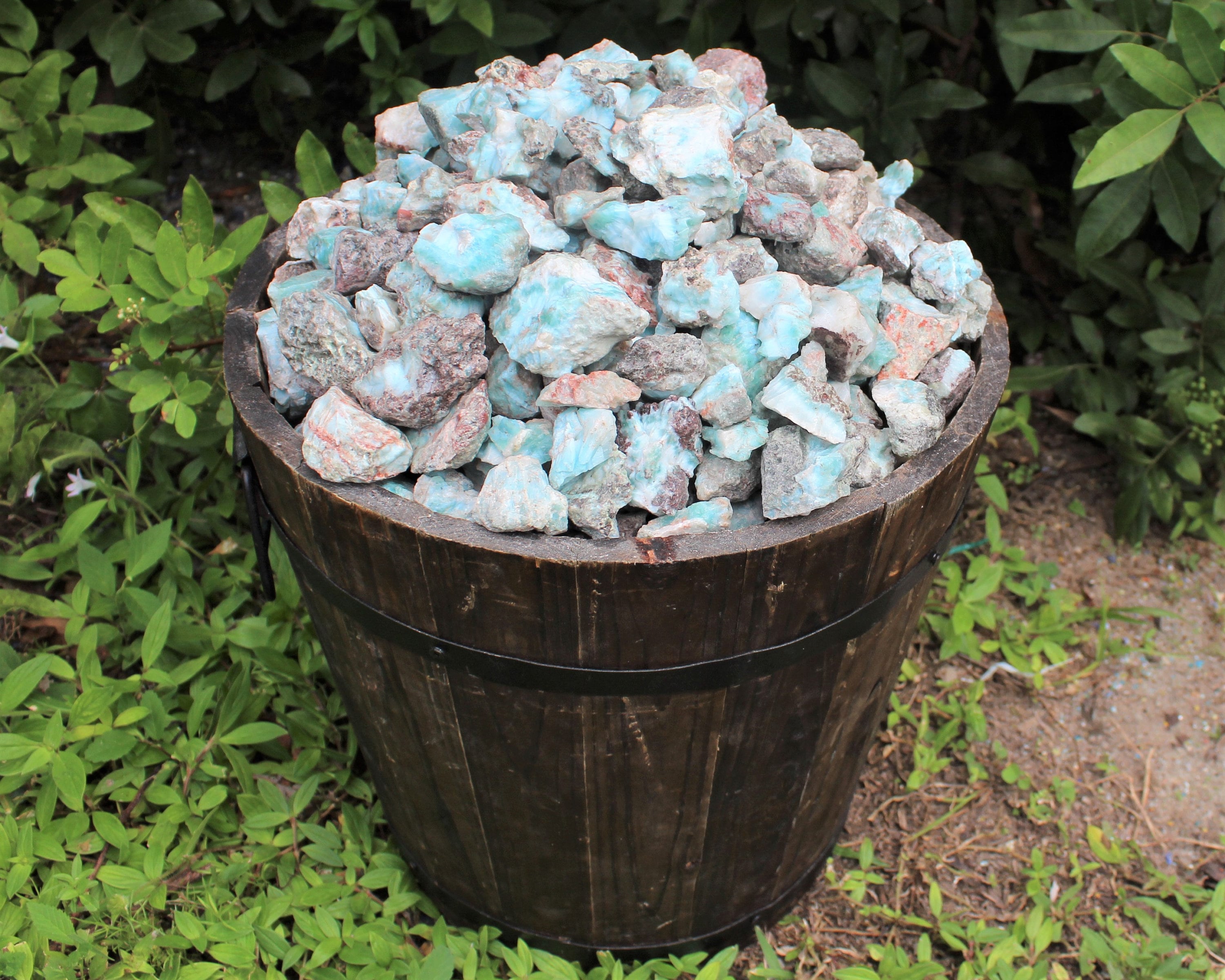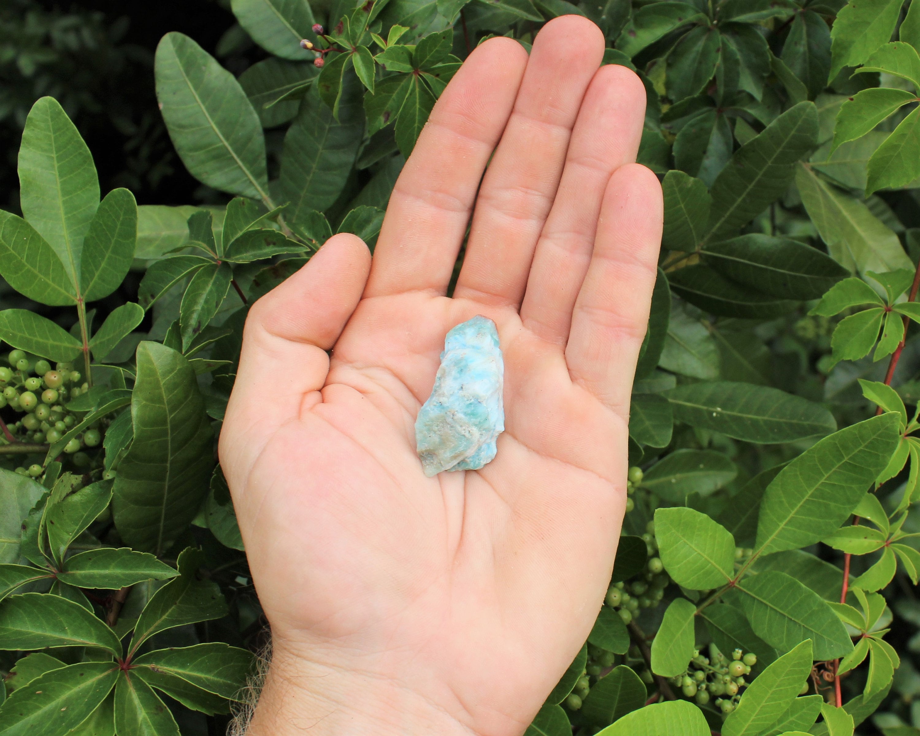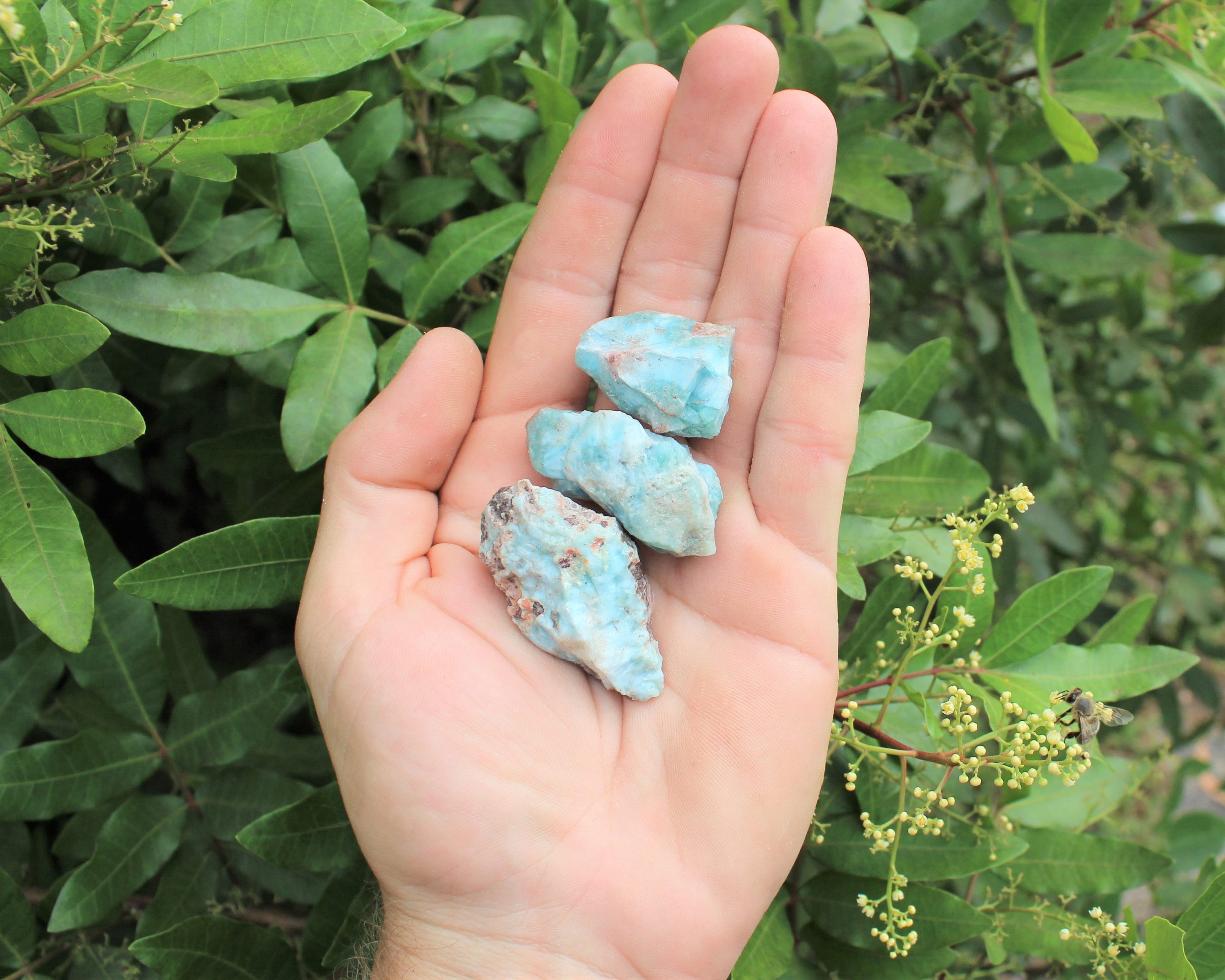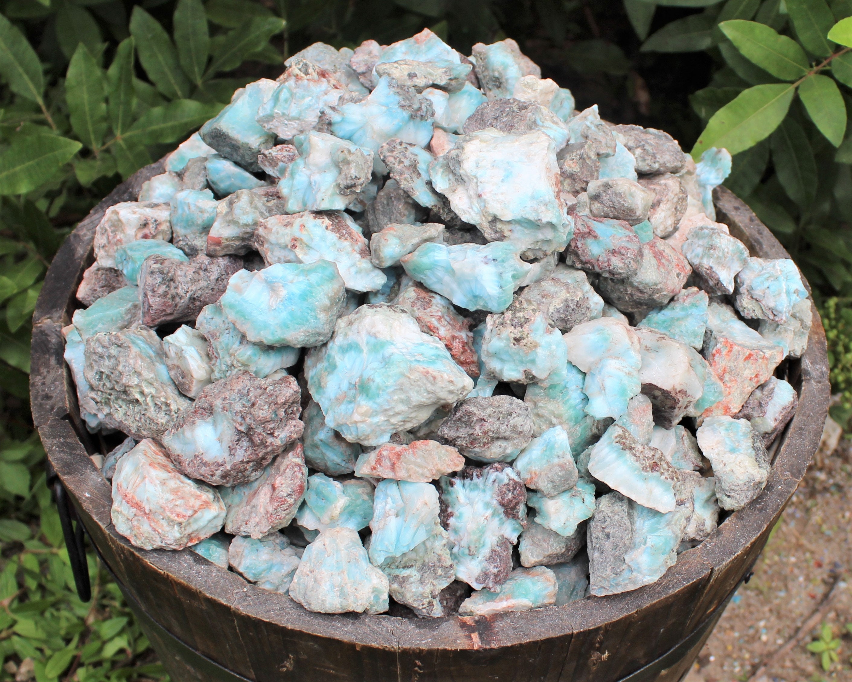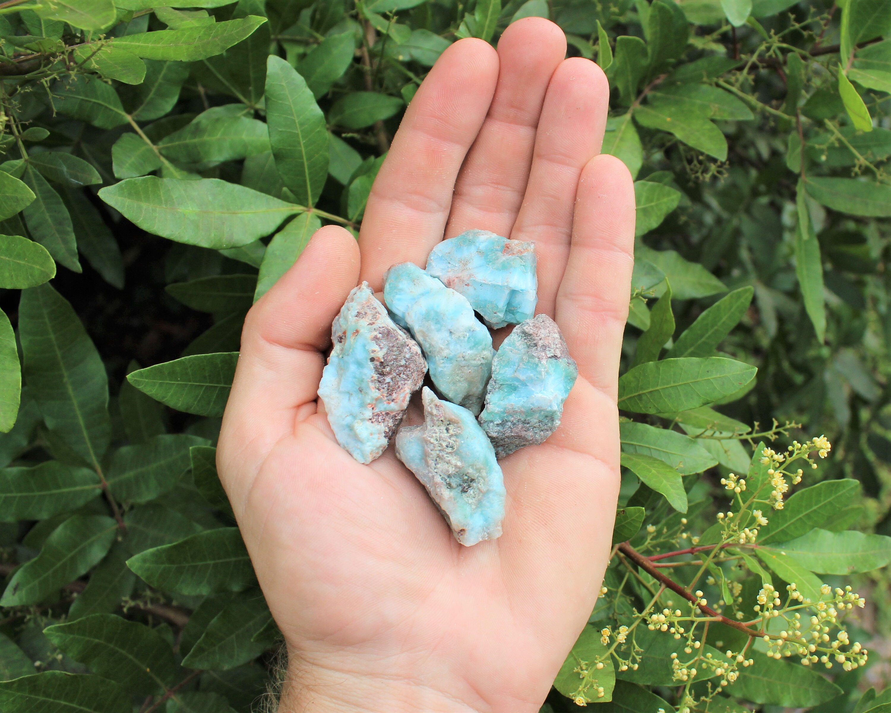 High quality Rough Larimar crystals. Size ranging from 0.75" - 1.5" +/-. Rough Larimar is such a mysterious beauty. Underneath the raw exterior of these pieces, lies some absolutely stunning colors and patterns. Perfect for polishing, cabbing, lapidary, jewelry making or just decoration. Larimar is said to represent peace and clarity while stimulating throat, heart, third eye and crown chakras. From first glance one can feel the powerful calming and relaxation energy associated with Larimar. It truly has to be one of the most beautiful crystals we stock with its natural light ocean blue and rich inclusions. It reminds us of an alluring Caribbean lagoon blessed with untouched beauty. Larimar is only found in the Dominican Republic right in the middle of the Caribbean Sea.