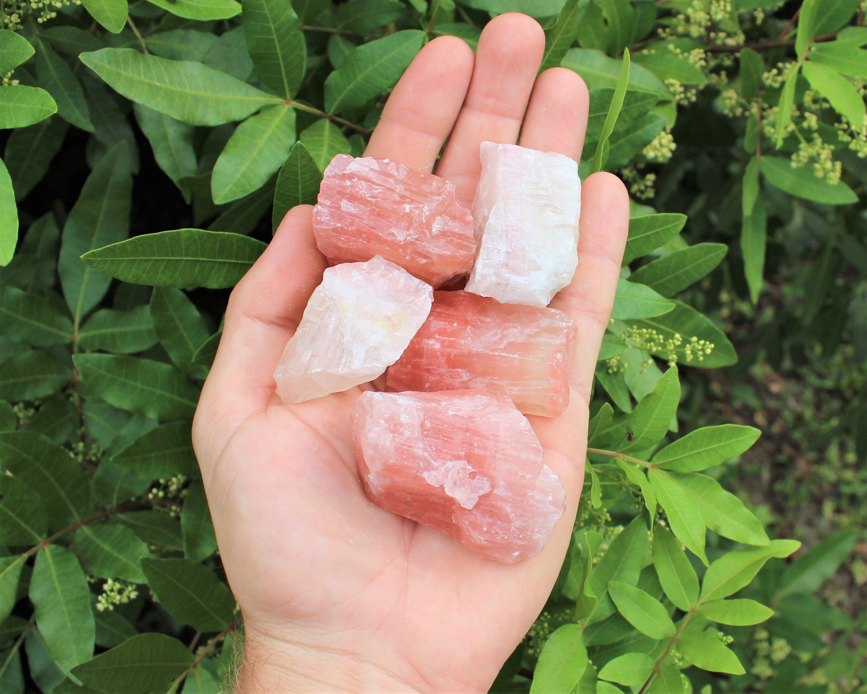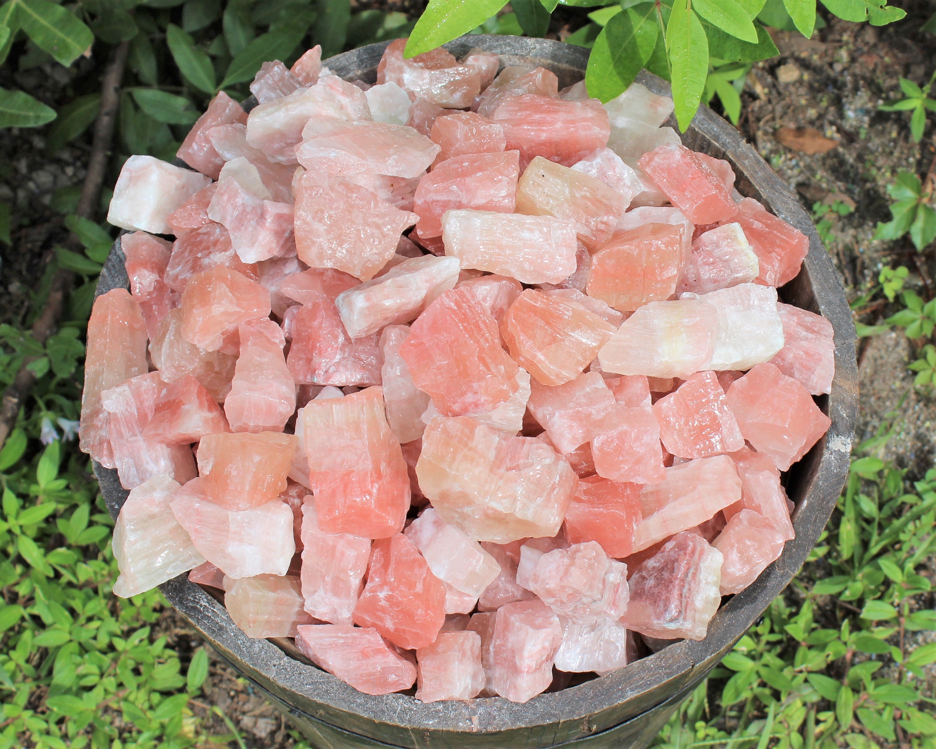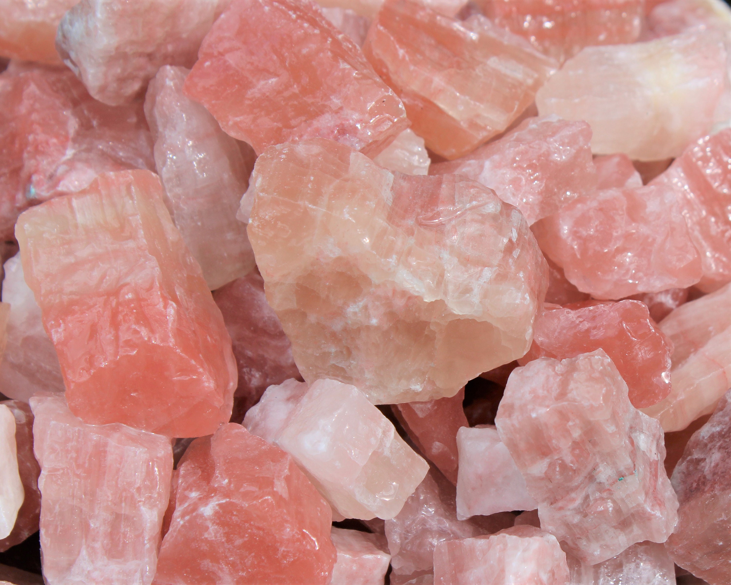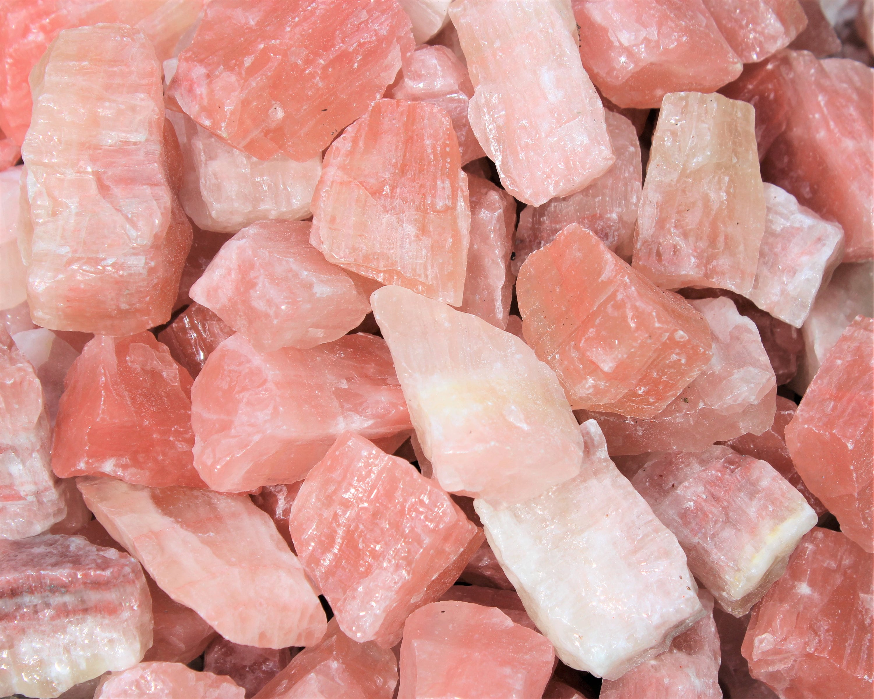 Premium Grade Lots of Natural Rough Strawberry Calcite, size between about 1" to 2.5" +/-. You can choose the size of your order - 4 oz, 8 oz, 1 lb, 2 lb, 5 lb or 10 lb. On average 1 lb lot will contain approximately 6 - 10 individual pieces.