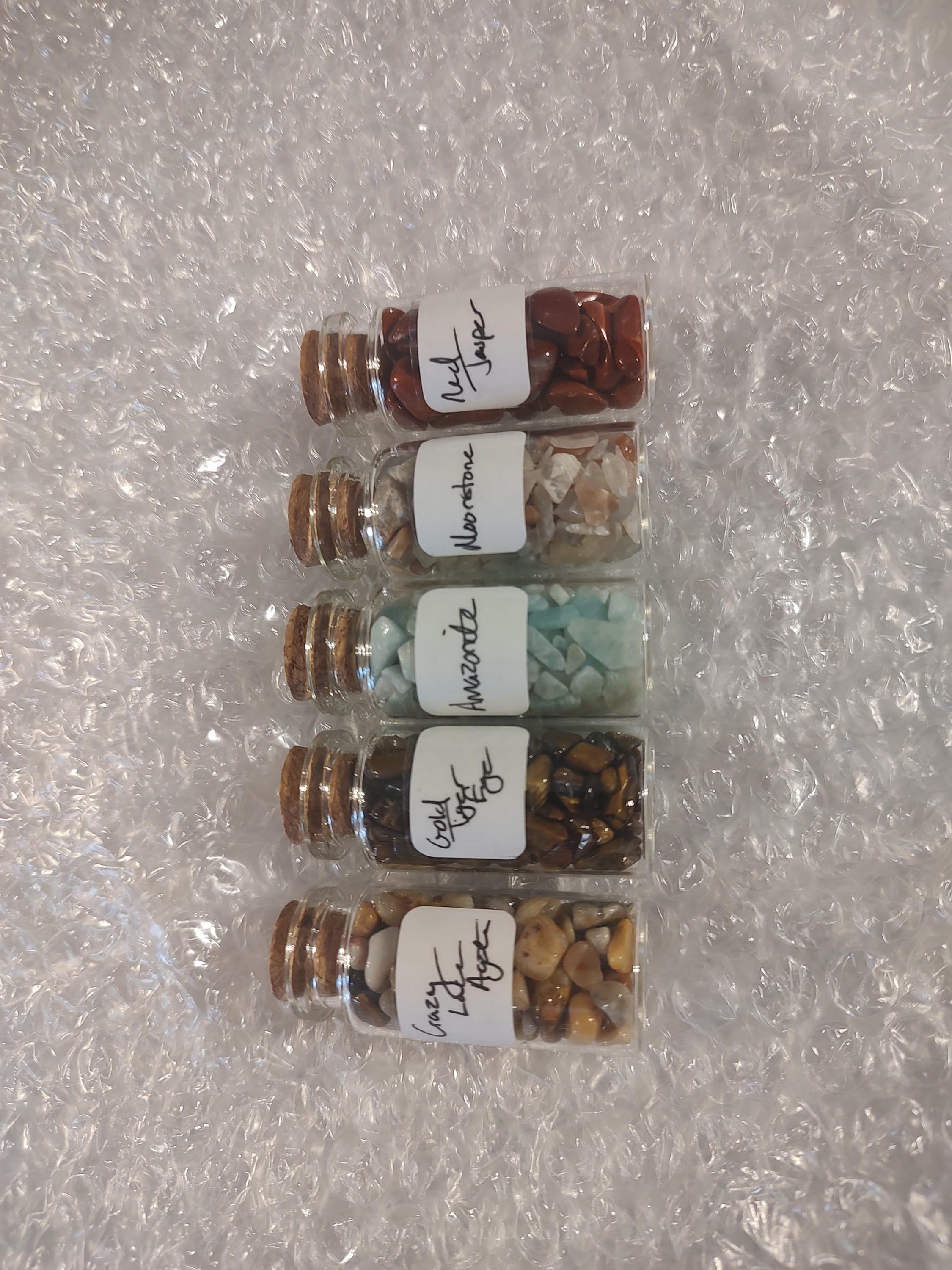 Genuine Natural Gemstone tumbled chips in a large 2" tall glass bottle, each with cork stopper and labeled! Bottles stand about 2.25" tall with cork top added and are about 1" in diameter. Great for both collectors or beginners alike!