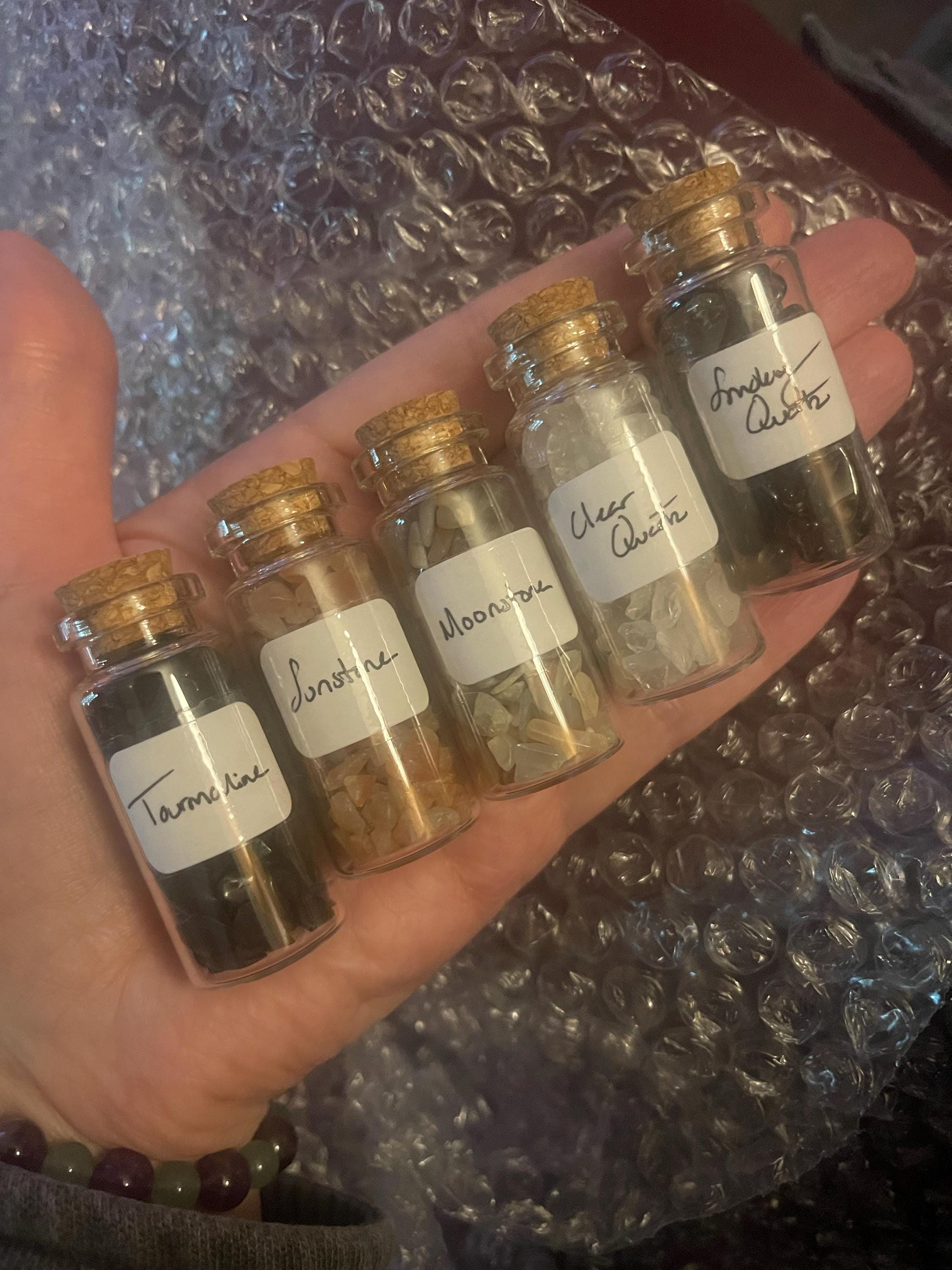 Genuine Natural Gemstone tumbled chips in a large 2" tall glass bottle, each with cork stopper and labeled! Bottles stand about 2.25" tall with cork top added and are about 1" in diameter. Great for both collectors or beginners alike!