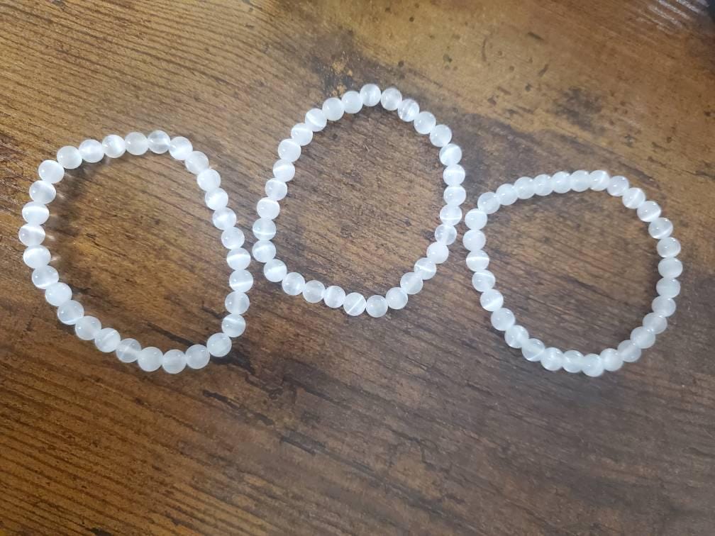 A beautiful bracelet crafted from Selenite beads. Choose 6 / 7 mm or 8 mm thick beads on a stretchable bracelet, fits most wrists. About 7.5" in size. Great for meditation, crystal healing, Reiki or simply wearing!