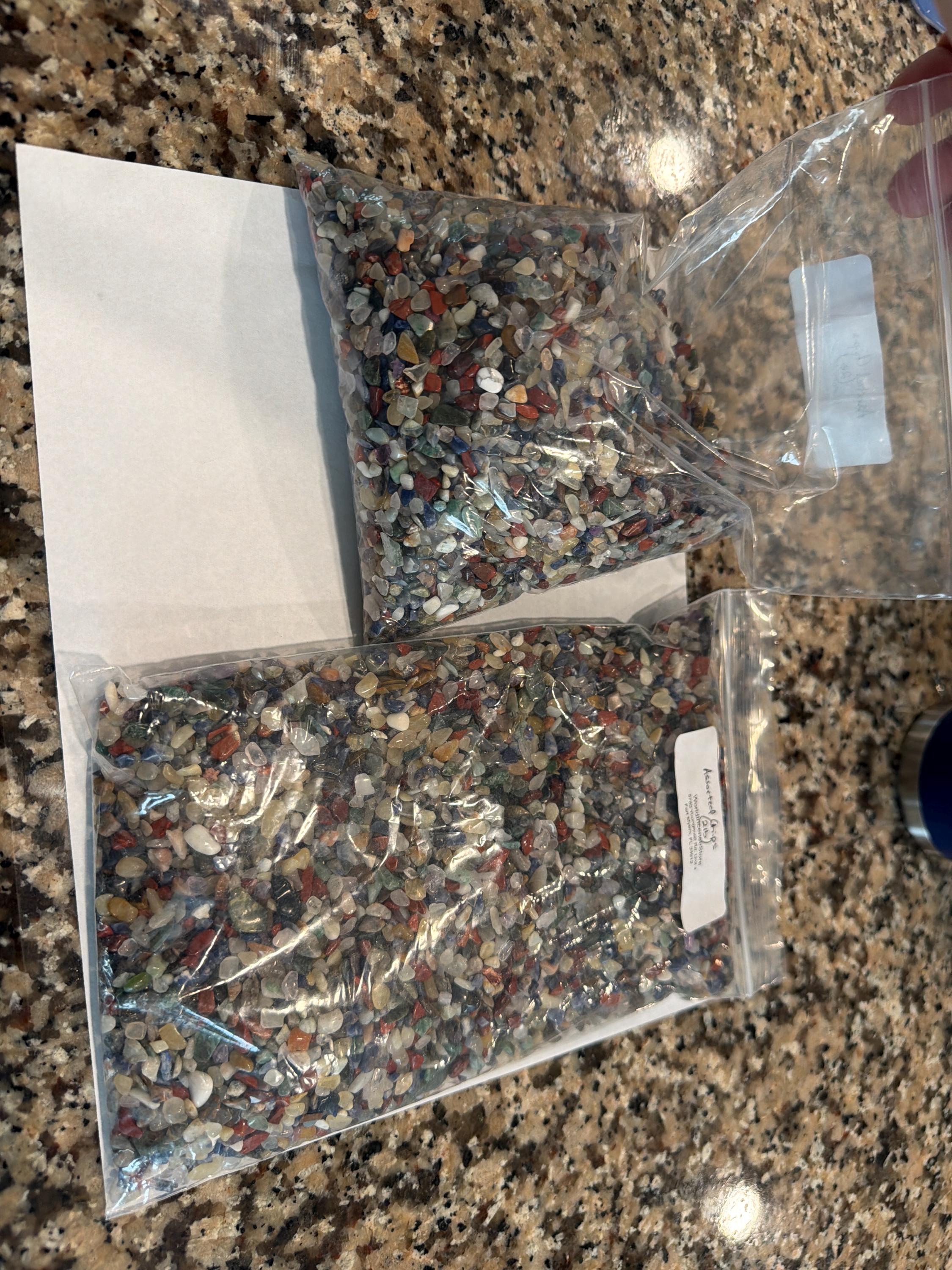 Choose your mini semi tumbled gemstone chips and amount from the drop down menu. Assorted mixed irregular sizes, in the range of about 3 - 15 mm.