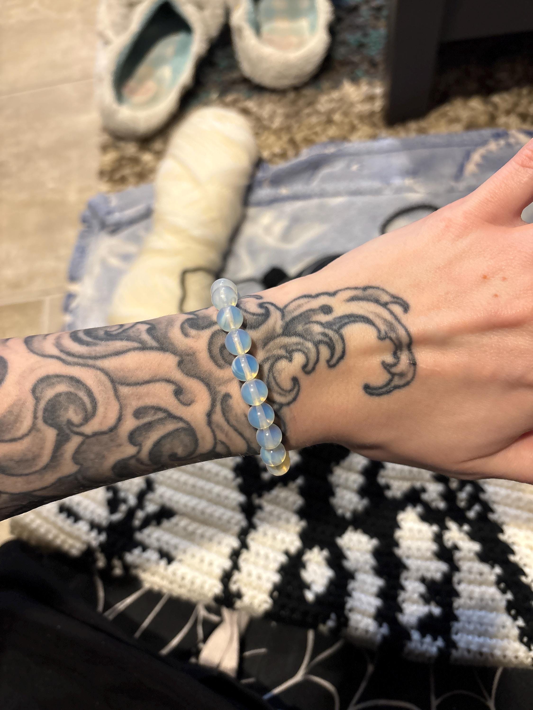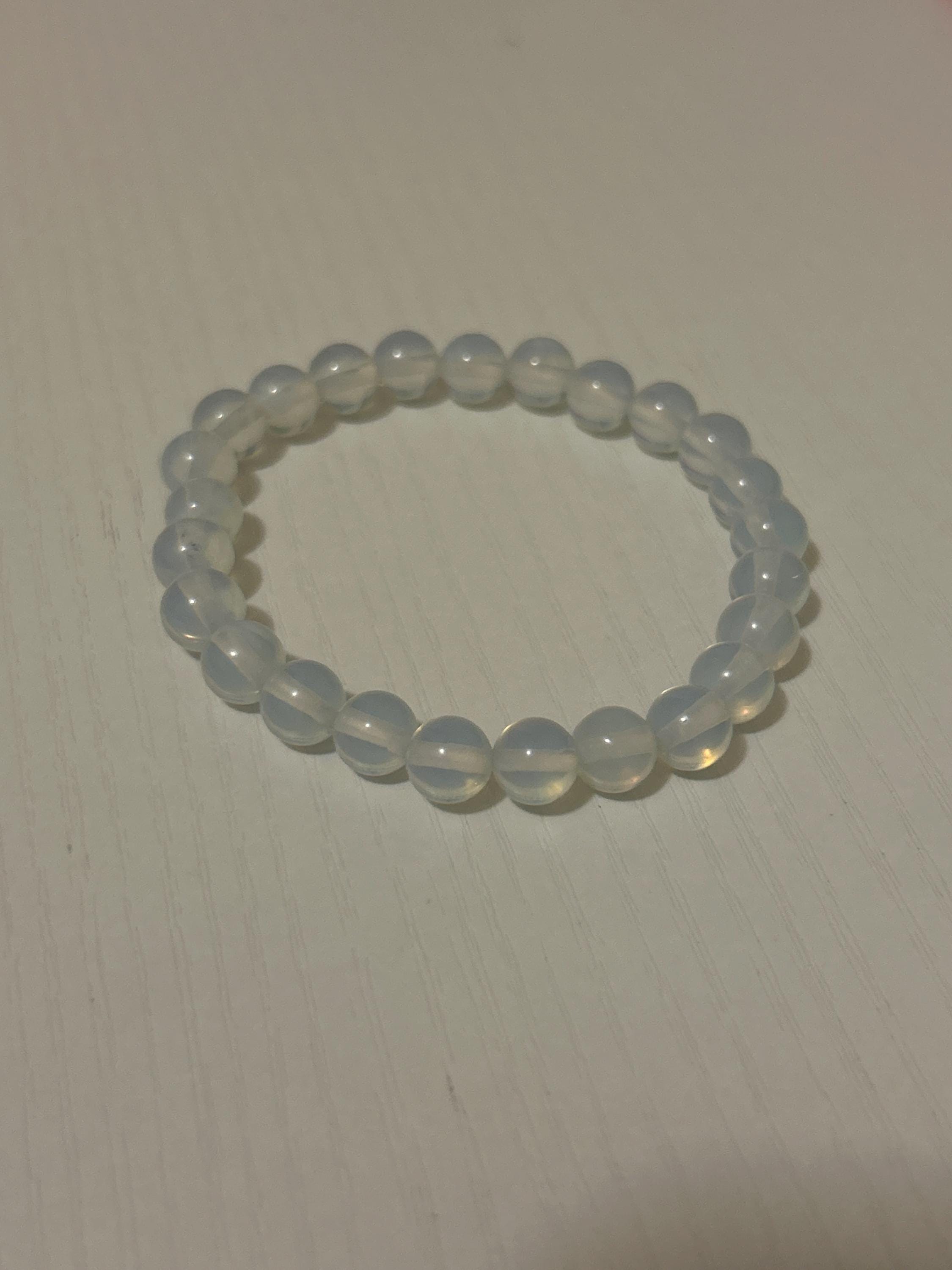 A beautiful bracelet crafted from Opalite beads. 8 mm thick beads on a stretchable bracelet, fits most wrists. About 7.5" in size. Great for meditation, crystal healing, Reiki or simply wearing!
