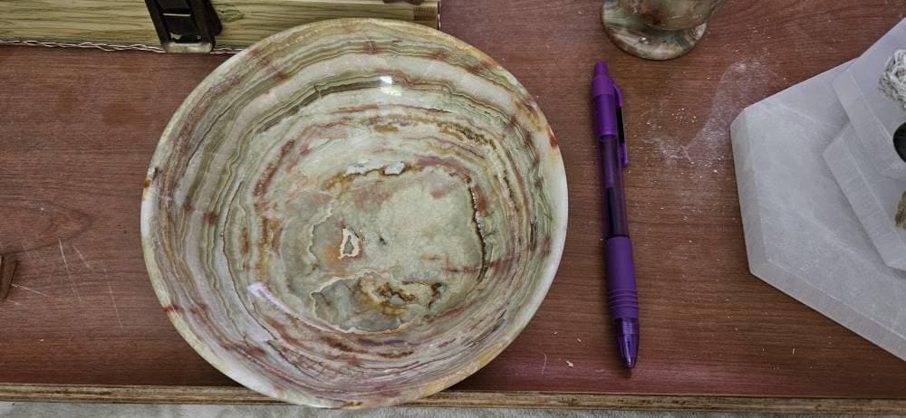 Each bowl is individual and distinctive so do expect some variance in size, color and shape from piece to piece. Sale is for 1 single piece selected at random at time of shipment. Please note the tumble and natural stones shown inside the bowl are for illustration only and are not included in the sale.