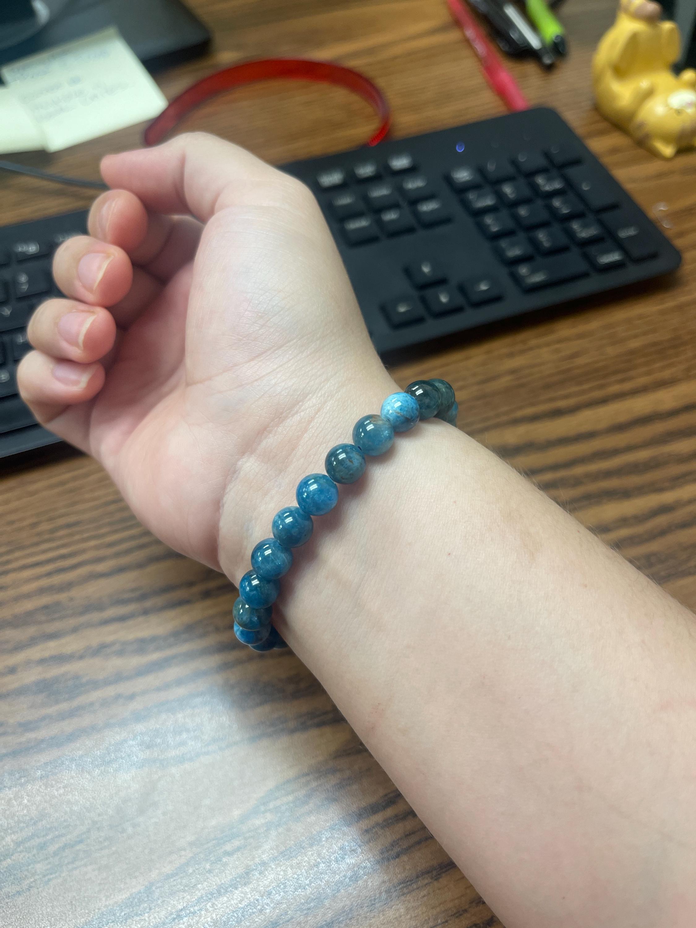 A beautiful bracelet crafted from Blue Apatite beads. 8 mm beads on a stretchable bracelet, fits most wrists. About 7.5" in size. Great for meditation, crystal healing, Reiki or simply wearing!
