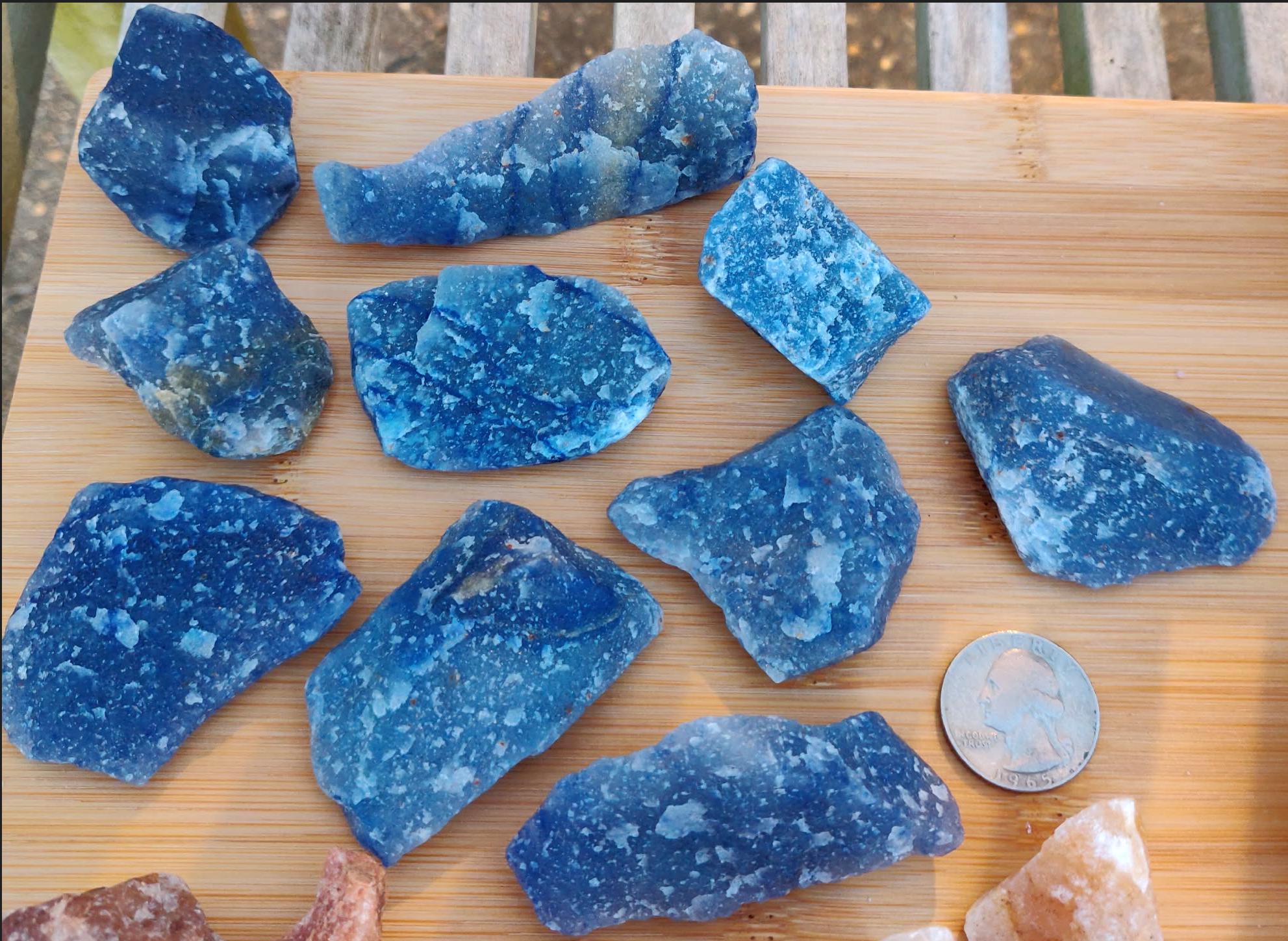 Premium Grade Natural Rough Blue Quartz, size between about 1" - 2", from Brazil. High quality specimens. A soothing and gentle crystal, Blue Quartz is a stone known for enhancing creativity and works especially well with the throat chakra.