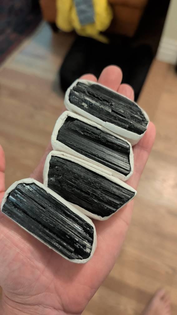 Please be aware that these tourmaline logs are very fragile in nature. This is due to the striations present in this grade of material. As a result you will almost always see some minor crumbling of the edges and a small amount of particles in the packaging material. This is 100% normal and almost unavoidable when sending tourmaline through the mail.