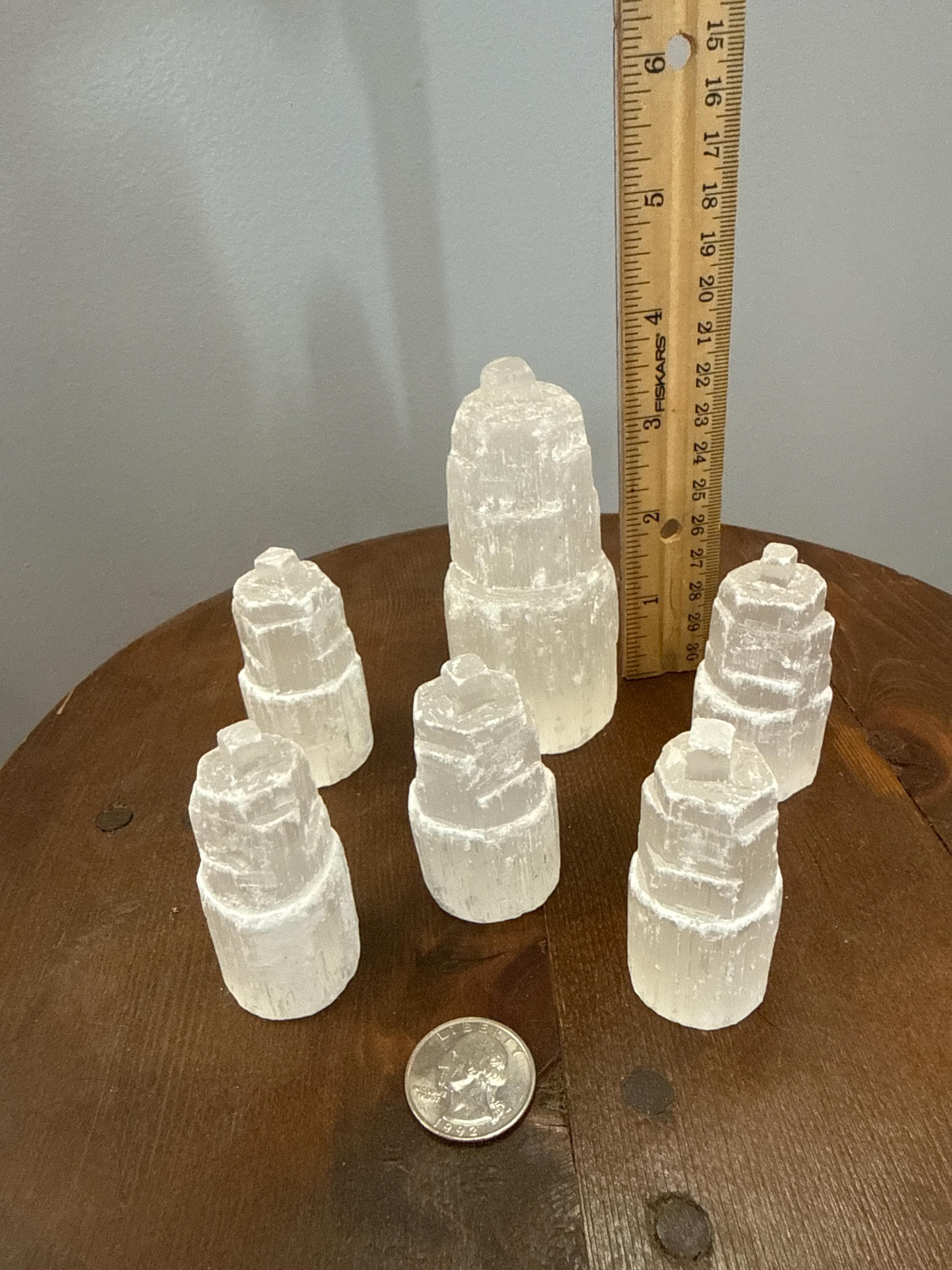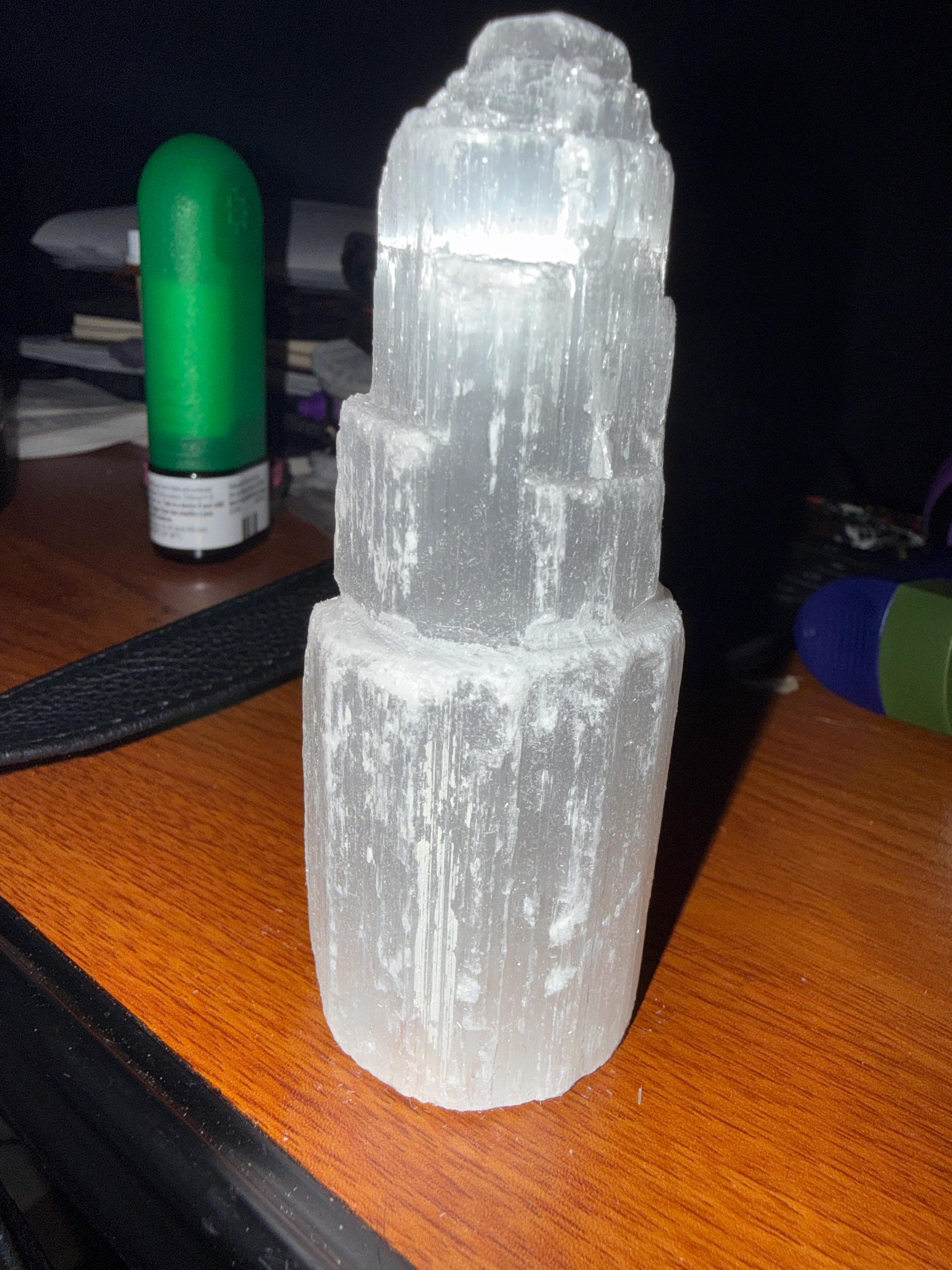 This is a natural product so specification varies from item to item. Each piece is unique - some 'fatter', some 'thinner'. Your piece will be selected by us at random. Selenite scratches, chips, dents, and fractures very easily. Due to its soft nature, please expect all Selenite products to have some minor 'imperfections'. We have posted pictures of multiple towers to give you an idea of the variance in size and shape from piece to piece.