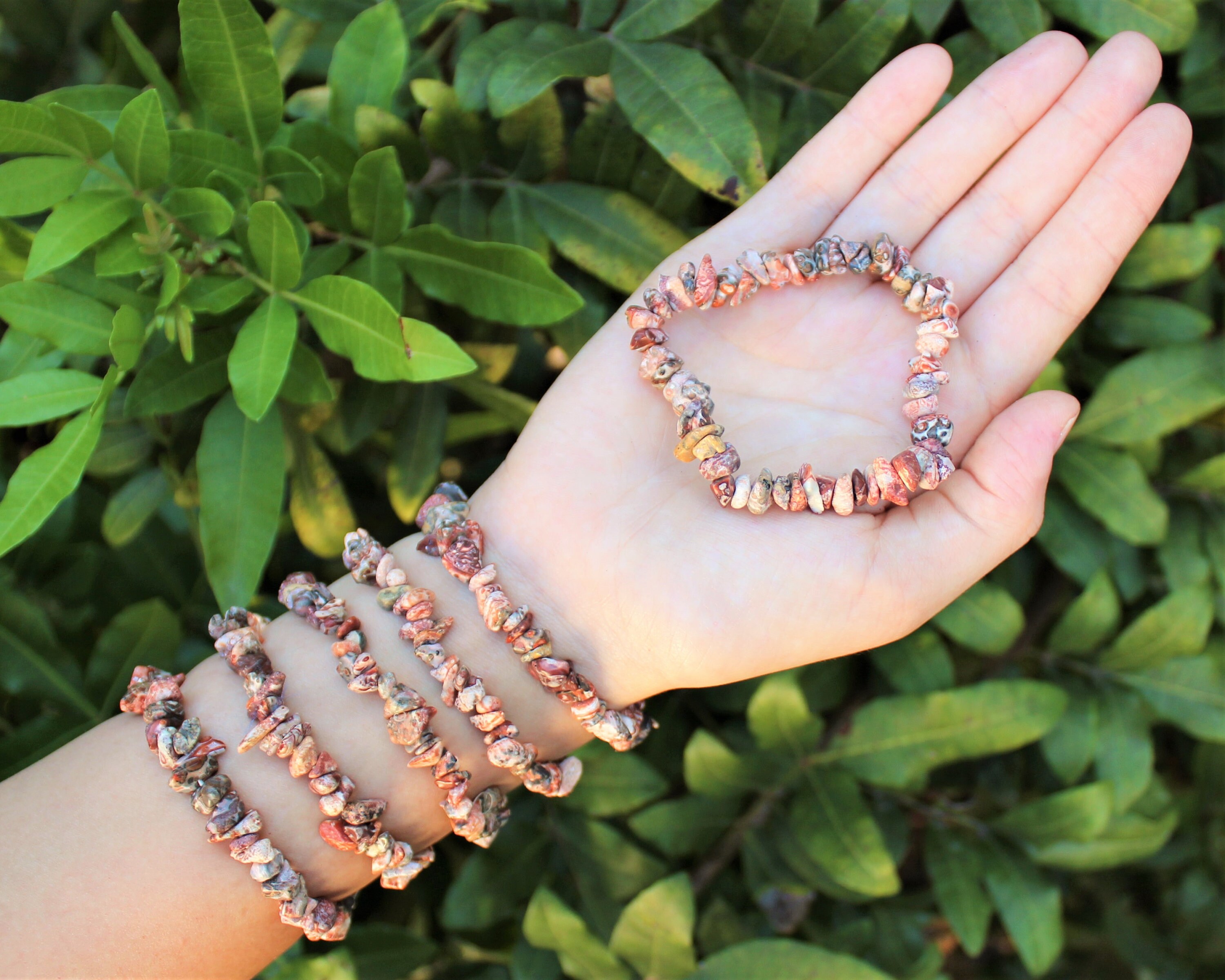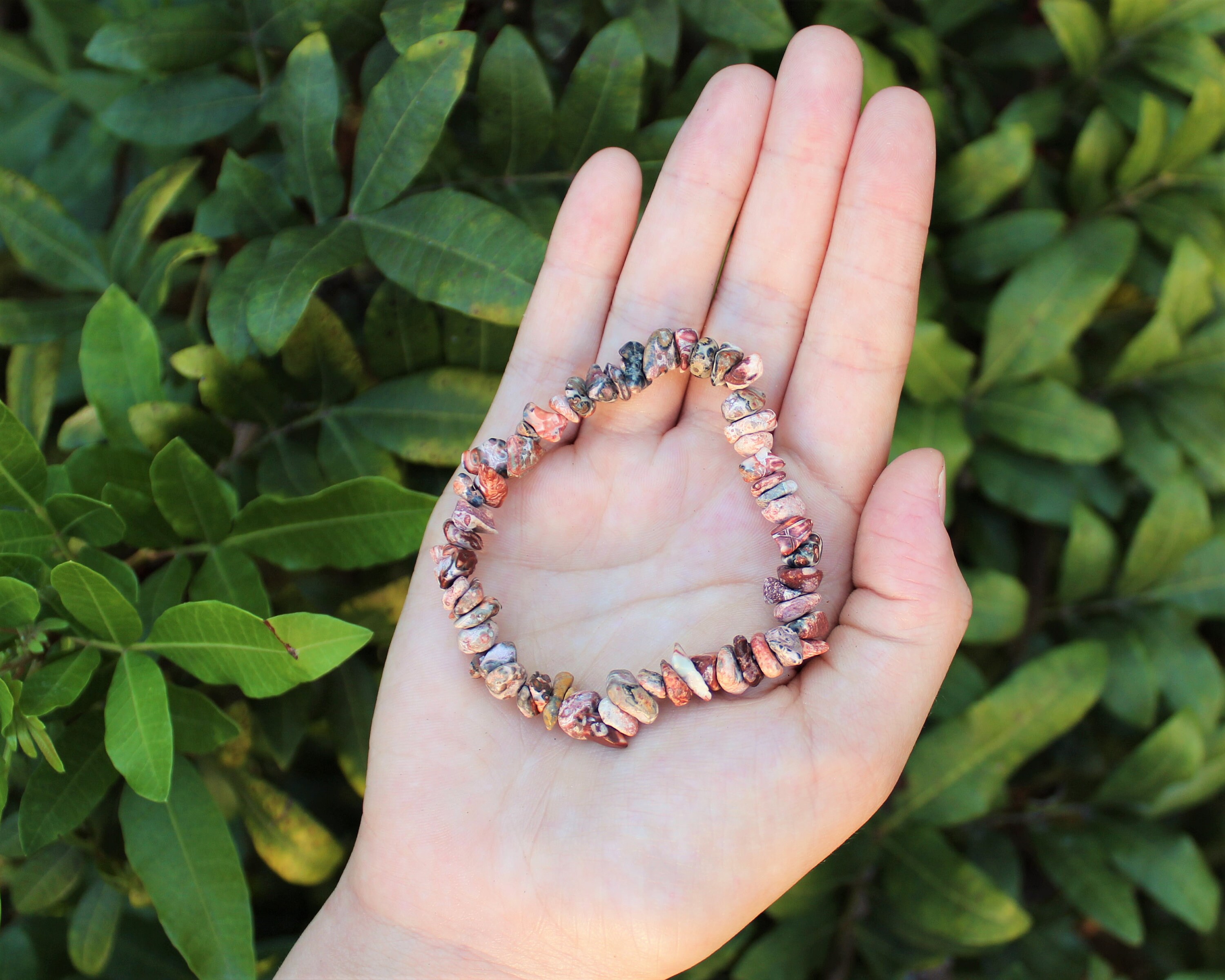 A beautiful bracelet crafted from Leopard Skin Jasper tumbled chunky chips on a stretchable bracelet, fits most wrists. About 7.5" in size. A stunning gemstone with a wide variety of color configurations, Leopard Skin Jasper's unqiue colors make it a joy to wear. This stone has quickly become one of our favorites at Worldincensestore! Great for meditation, crystal healing, Reiki or simply wearing!