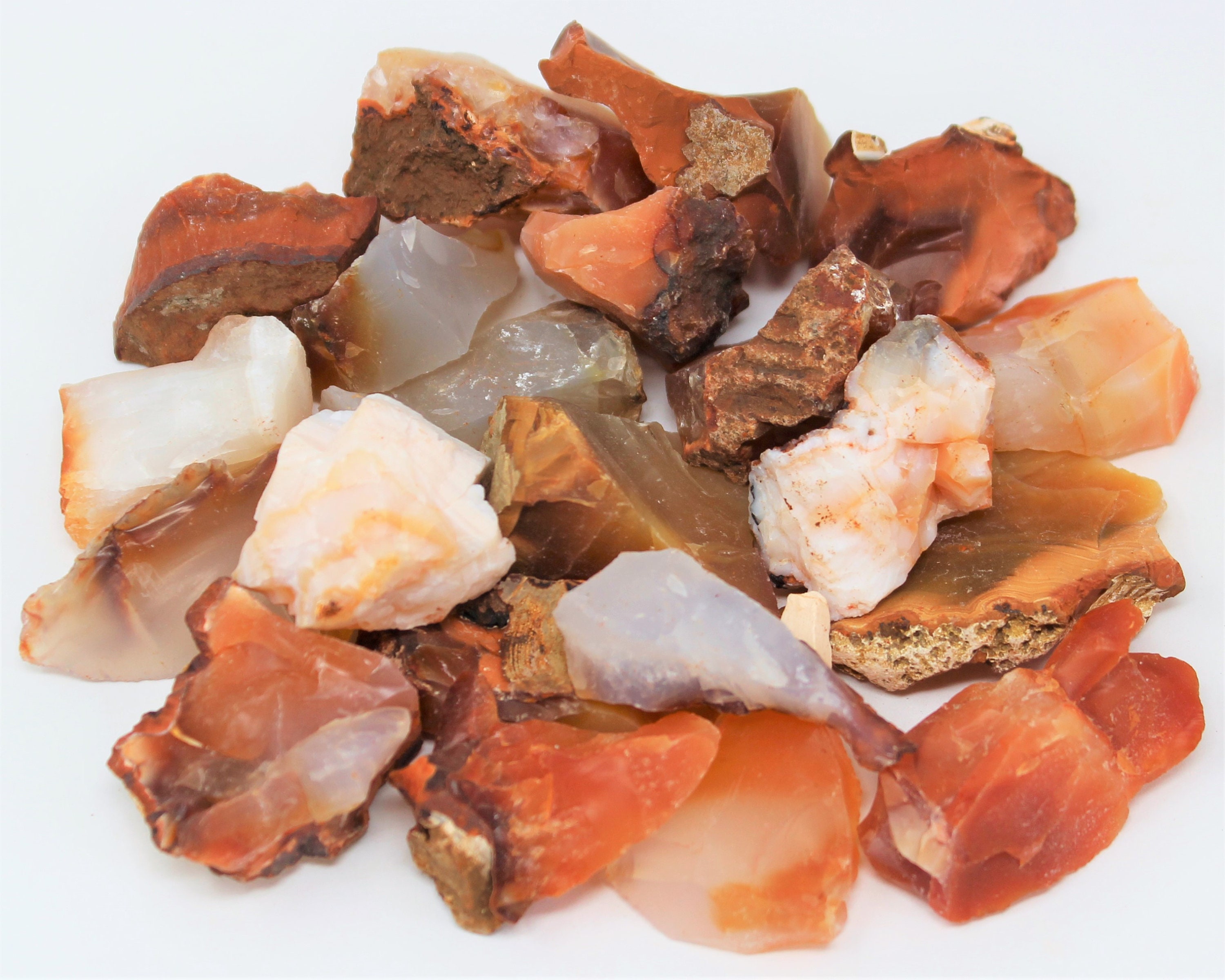 Lots of Small Natural Rough Carnelian, size between about 0.55" to 1.25", from Madagascar. Beautiful High quality specimens. These Raw Carnelian 'Chips' as we call them are a beautiful array of Red, Orange, White, Brown and Gray. Perfect size for jewelry making , tumbling, art projects or just decoration. Each lot will consist of a combination of all the different colors of Carnelian.