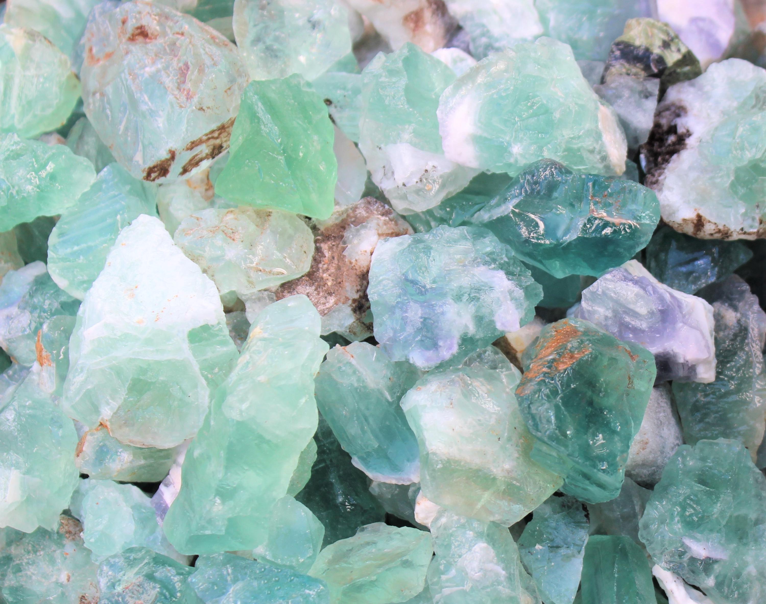 Natural Rough Fluorite Crystal From Mexico, size between about 1" to 2.5" +/-. We offer several grades of Rough Fluorite in our store whilst all stunning this latest addition we designated as 'B' Grade or Clearance. These crystals are very beautiful but they are slightly lighter and less uniform than their higher quality darker counter parts. That's the beauty of crystals, one persons clearance is a another persons 'A' Grade. The coloration of these fluorite stones range from greens, purples, rainbows and more. An unbeatable value!