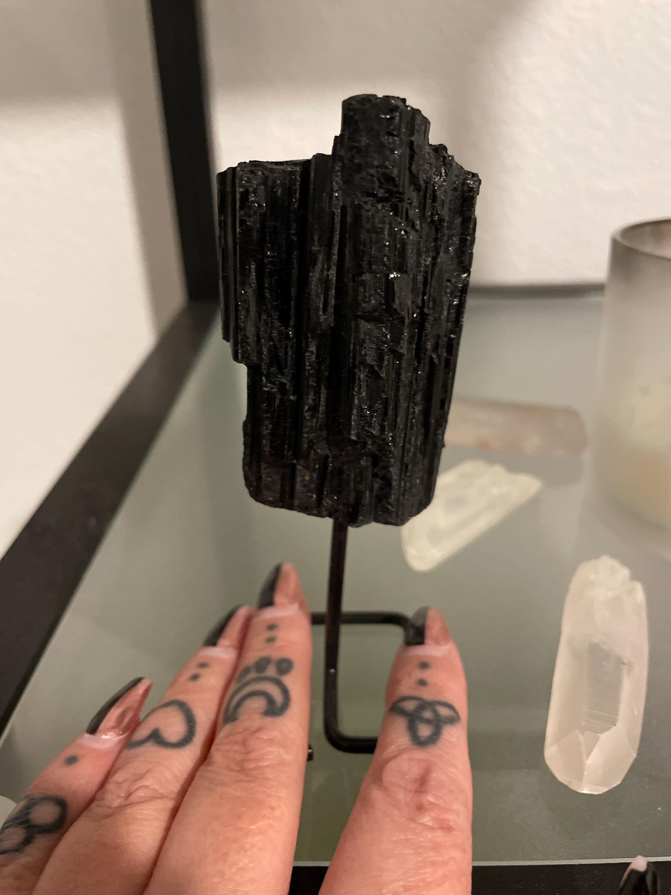 Beautiful Black Tourmaline Logs on metal stands. Each specimen is unique, ranging in size from 3 - 4" +/- (Total height on Stand). These are wonderful display specimens perfect for decoration, altars and meditation. Tourmaline is especially useful in terms of protection and repelling negative energy. Easily place them around your house or at work for a perfect reminder of the wonderful energy of crystals. The metal stand or "Mini Pin" bases are just over 1.5" wide making them very sturdy.