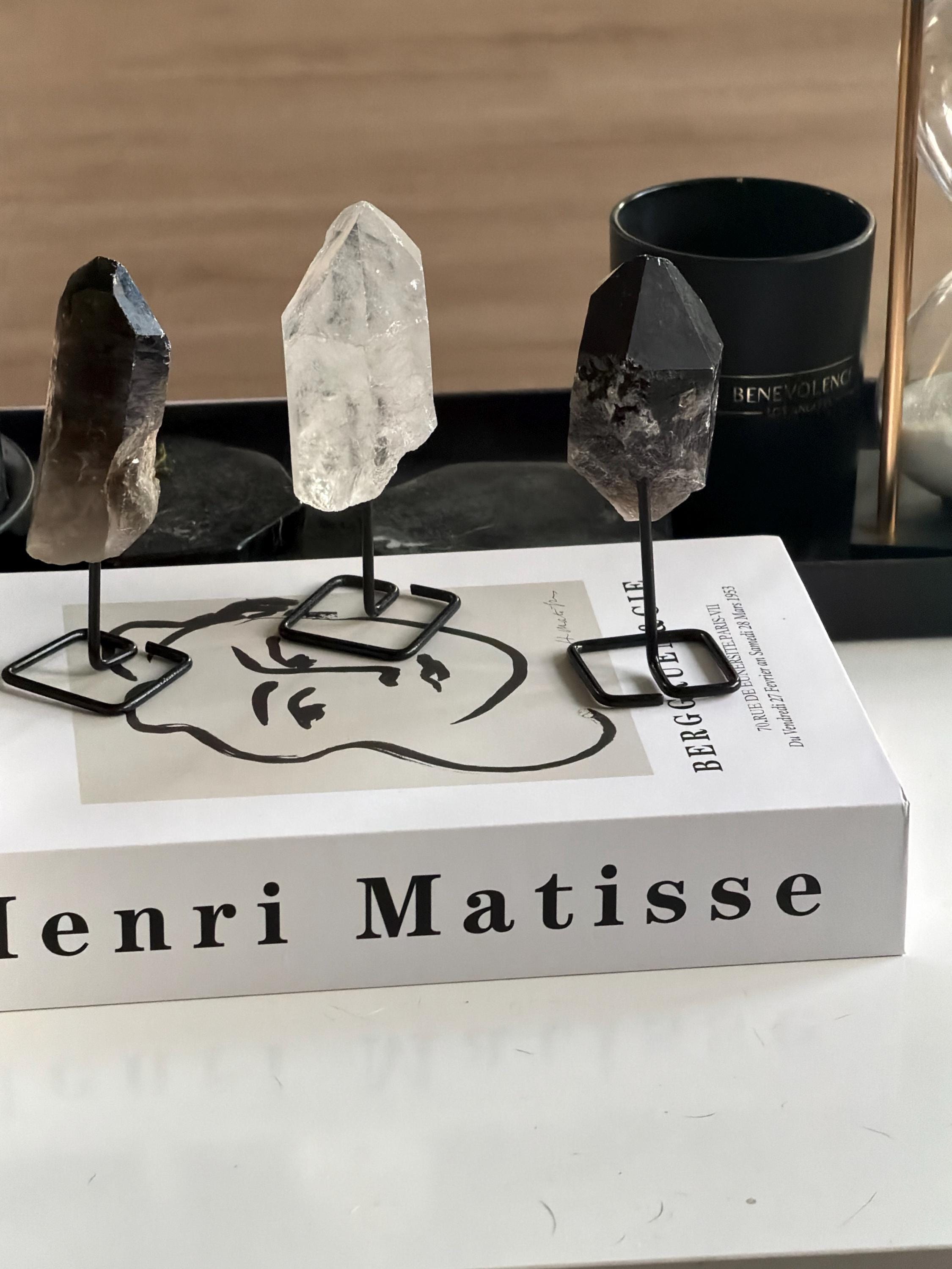 Beautiful Clear Quartz Points on metal stands. Each specimen is unique ranging in size from 4 - 5" +/-. These are wonderful display specimens perfect for decoration, altars and meditation. Easily place them around your house or at work for a perfect reminder of the wonderful energy of crystals. The metal stand or "Mini Pin" bases are just over 1.5" wide making them very sturdy.