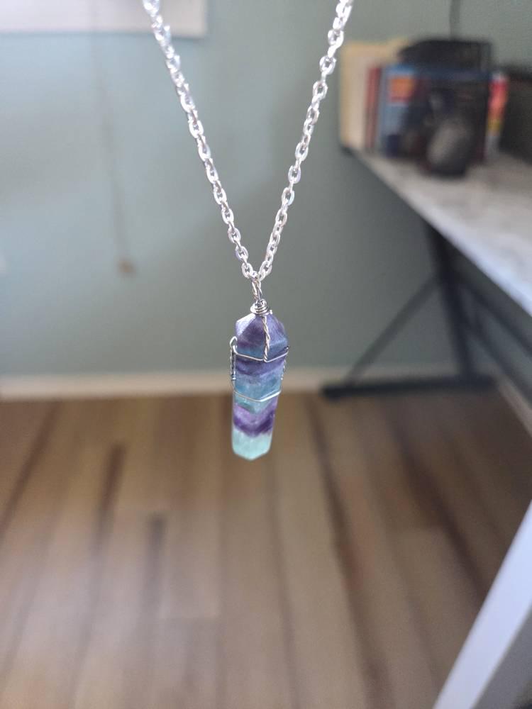 Beautiful Fluorite Crystal Pendants wrapped in wire. These double terminated faceted pendants measures about 1.5 - 1.75" +/-. You can select just the pendant by itself; or add an 18" / 24" Chain. These are 'AAA' quality real crystal pendants at an unbeatable value.