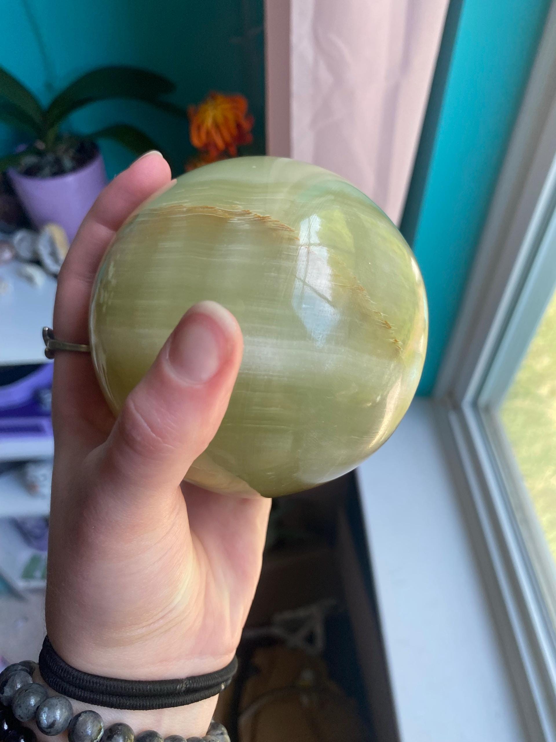 These HUGE beautiful onyx spheres are very calming and soothing. Green with mixtures of browns and creams these are simply stunning to look at - they make wonderful decorative pieces around the home in addition to their use in crystal healing. One very unique characteristic of Green Onyx is that almost every piece is completely unique. Every Sphere has such interesting coloration and banding really adding to its allure. Each piece is about 4" - see posted pictures - and about 2.5 - 3 lb +/- in weight. A March birthstone Green Onyx is associated with the Heart Chakra. Each Sphere comes with a small plastic display stand measuring about 1.75" across.