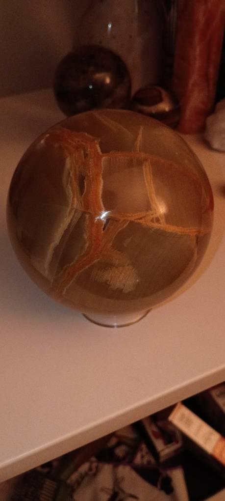 I received my 2nd sphere today. They are both very beautiful and both very different looking. I picked one up with one hand and found that it's heavier than I expected. It's about the size of a grapefruit. I'm truly happy with them. They came with a clear acrylic sphere holder, which was lovely, and I didn't expect to get them with the crystal. I took 2 pictures, and I moved them a little for a slightly different view of them, and I'll post them both if I can. Unfortunately, the holders were broken when they arrived.