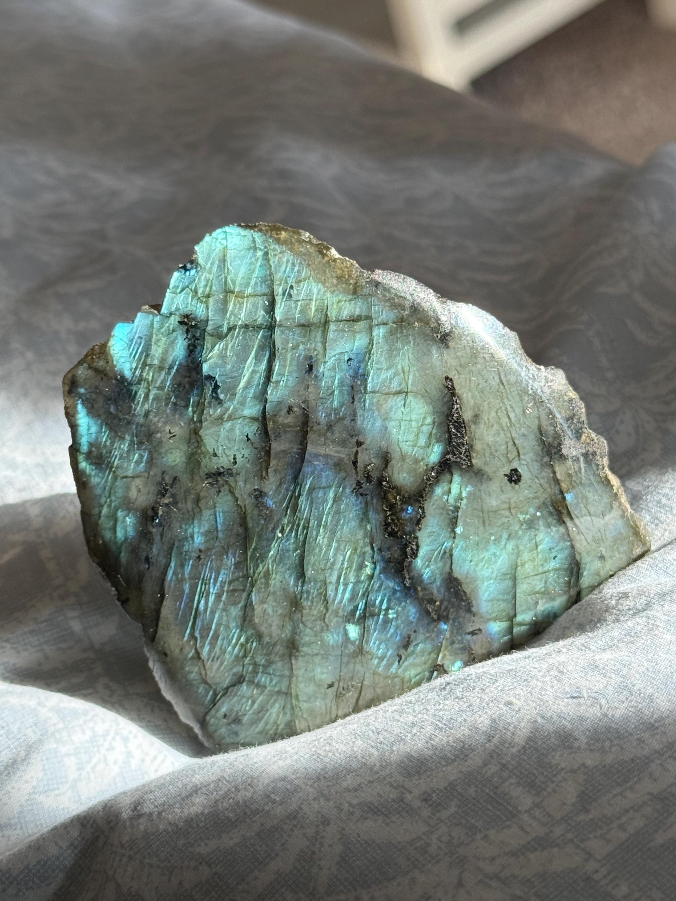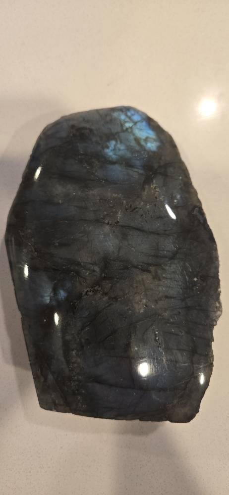 Magnificent large Natural Labradorite Slabs with a Cut Base, self standing display pieces in a variety of sizes - from Madagascar. These stones are magnificent with wonderful visible flash. The bottom is cut flat allowing the specimens to stand upright, and the face beautifully polished. These make absolutely wonderful display pieces! The combination of a Rough natural back and a polished front face are a match made in heaven. All of these pieces display a beautiful luster reflecting at different angles. Each piece is highly polished and varies slightly in shape, weight and luster. Extremely unique specimens, a great gift for the avid collector or first time buyer!
