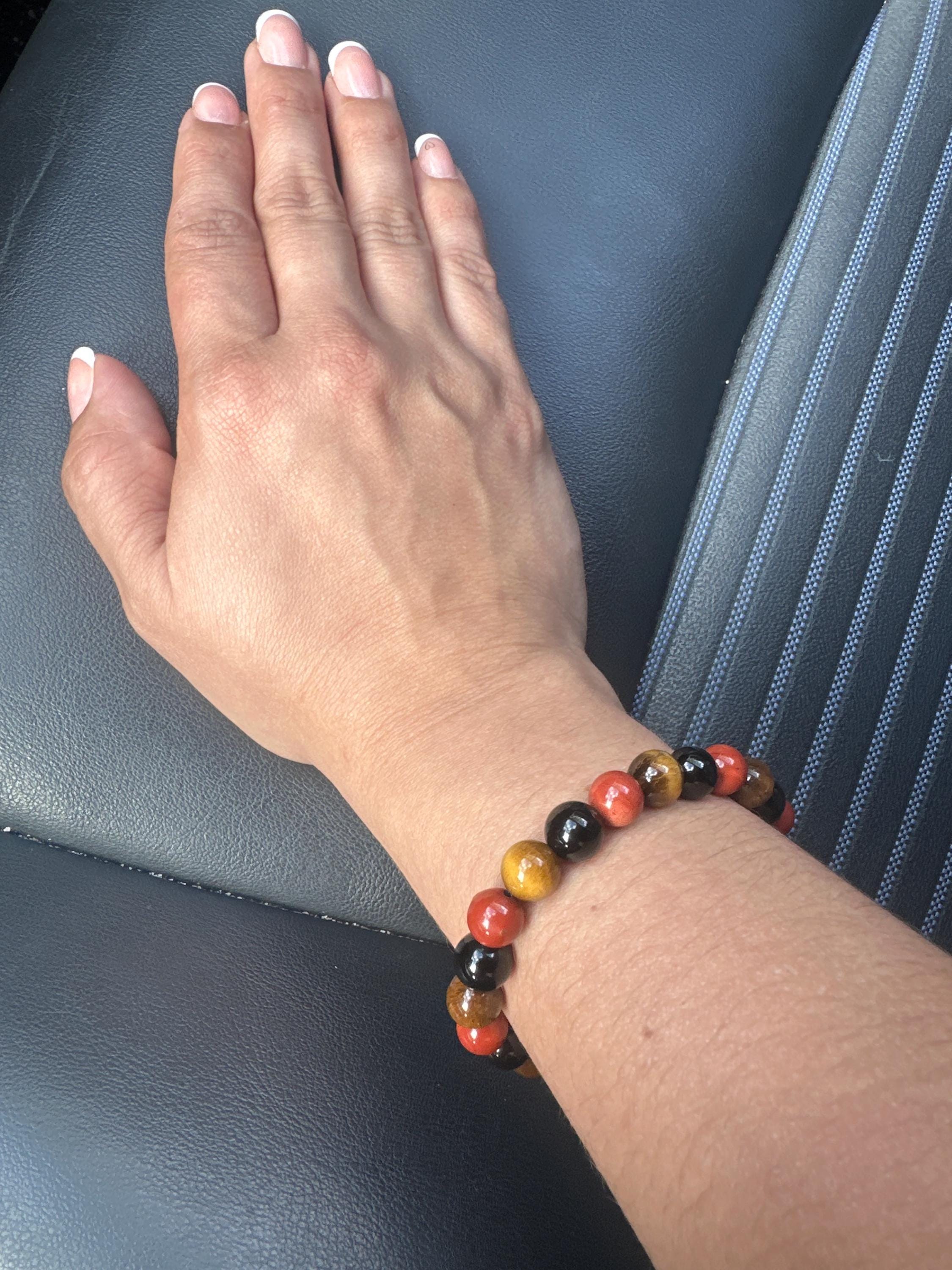 A beautiful bracelet hand crafted from Red Jasper, Gold Tiger Eye and Black Onyx beads. This carefully selected combination of three powerful strength crystals will assist in bringing inner power, confidence and clarity. 8 mm thick beads on a stretchable bracelet, fits most wrists. About 7.5" in size.