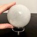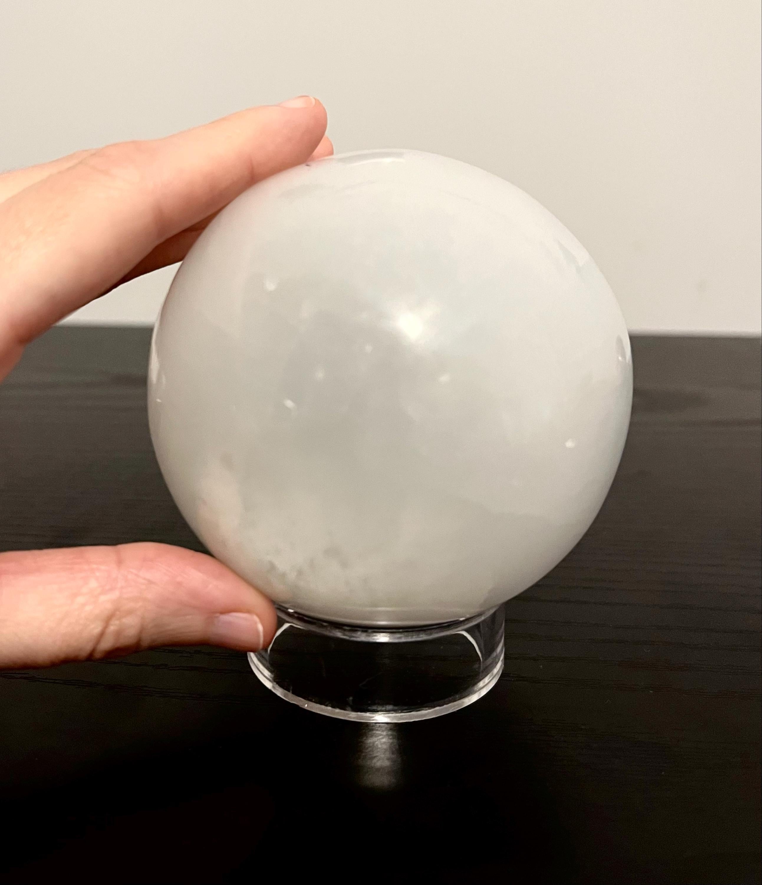 Stunning Huge polished White Selenite crystal spheres. Each Sphere is approximately 3" wide +/- (80 mm) and comes with a small plastic display stand measuring about 2.25" across.