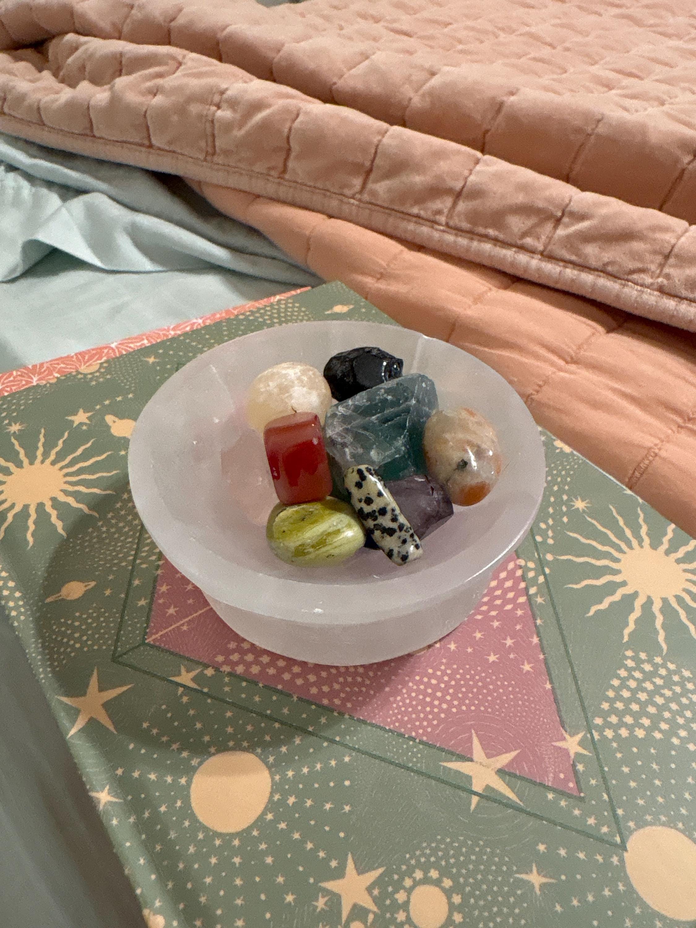 Some notes on the material: This fibrous crystal has natural fissures and fibers running through it - it can look like 'veins' running through the material. This can give the appearance of damage or 'cracks' - it is not - it is very normal for selenite. Due to its soft nature the outer rims of bowls can also show these 'cracks' or 'veins' and the edge can also look a little uneven with minor 'nicks' and 'scratches' - again it is normal for selenite. Selenite can have minor inclusions so the odd speck, dark mark or minor discoloration may be visible. Be aware that selenite should be kept away from water so do not use water to cleanse the bowl.