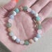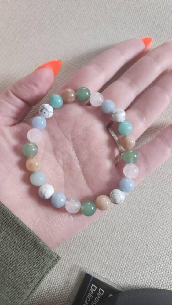 A beautiful bracelet hand crafted from 6 carefully selected Crystals that may help fill you with peace and serenity reduction. A stunning pastel color combination. Amazonite, Angelite, Green Aventurine, Moonstone, Rose Quartz, & White Howlite beads. 8 mm thick beads on a stretchable bracelet, fits most wrists. About 7.5" in size.