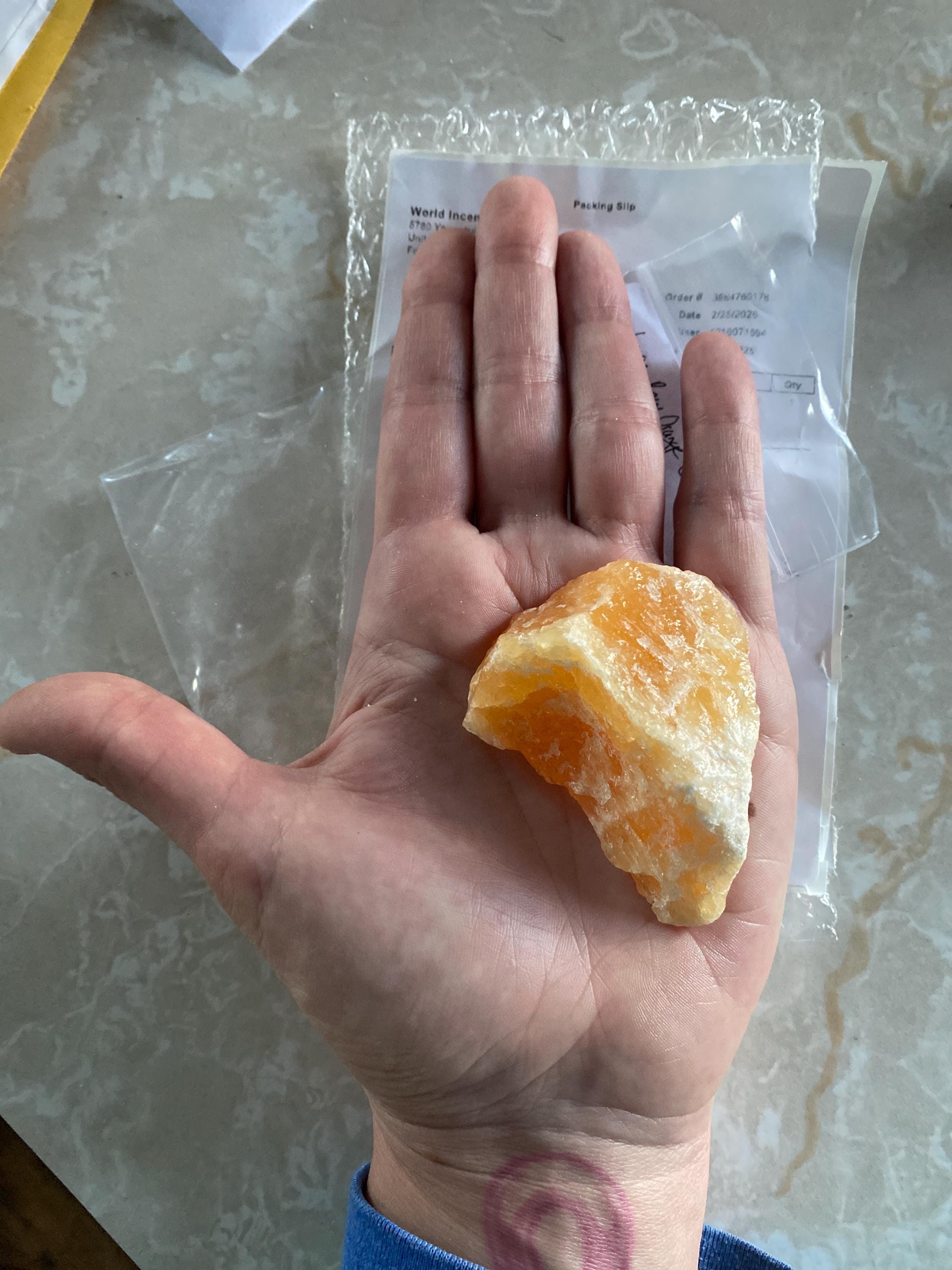 I have ordered from you before. This is disappointing. I ordered a large orange calcite, the one I got is maybe a medium size. It is half the size of the crystal you show in your description. (Unless you are using a child’s hand) The one I got is 2 inches long and an inch thick.