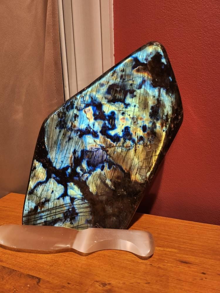 HUGE Magnificent polished Labradorite Free form, self standing display pieces in a variety of sizes - from Madagascar. These stones are Hand Chosen with huge amounts of wonderful visible flash. The bottom is cut flat allowing the specimens to stand upright. These make absolutely wonderful display pieces! All these pieces display a beautiful luster reflecting at different angles. Each piece is highly polished and varies slightly in shape, weight and luster. Each piece is unique, a great gift for the avid collector or first time buyer!