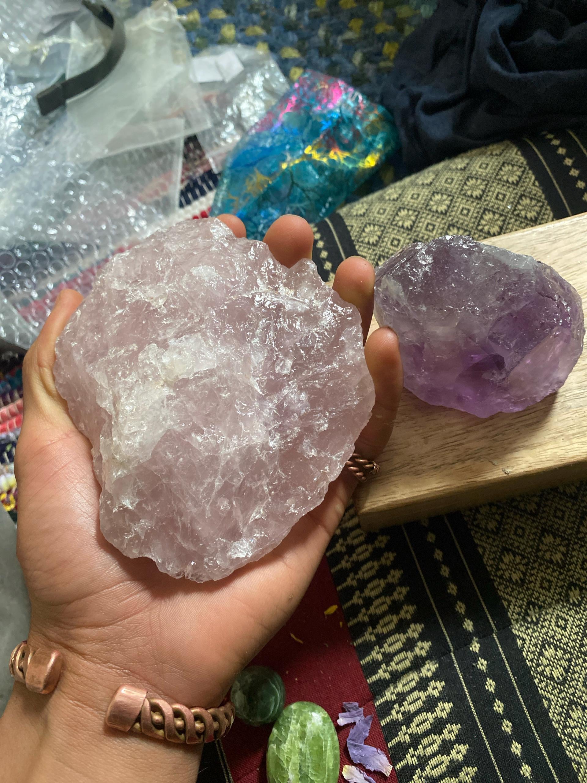 These beautiful pink Rose Quartz raw natural stones are extremely popular. Known as the ‘Love Stone’ it symbolizes unconditional love. Rose Quartz is a very calming, relaxing stone which is used often with the Heart Chakra. Used to attract love, many people keep stones in their bedroom (often in pairs). The stone will deter negative energy and restore love energy in its place. Rose Quartz is also believed to act as a 'Love Stone' in terms of assisting with emotional healing - helping those who are dealing with a break up come to terms with painful memories. Many people choose to site the stone in the center of their home (the heart of the home) where they also make great display specimens!