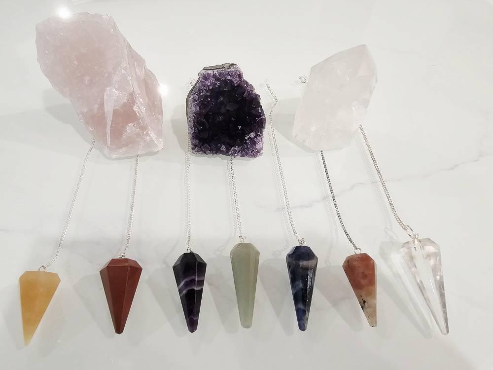 Pendulums are used for Dowsing & Divination purposes. These practices involve asking the universe for divine guidance which is then transferred through the Pendulum swinging one way or the other. This happens by letting ones energy connect between the earth and the cosmos. These tools can help with answering difficult internal questions as well as helping start the healing process. Certain Gemstones may also help unblock Chakras and clear negative energies. When used for Dowsing, the Dowser holds the chord in one hand allowing the pendulum to swing freely. Once it is free and undisturbed, the dowser can interpret the direction and motion of the Pendulum in regards to matter at hand.