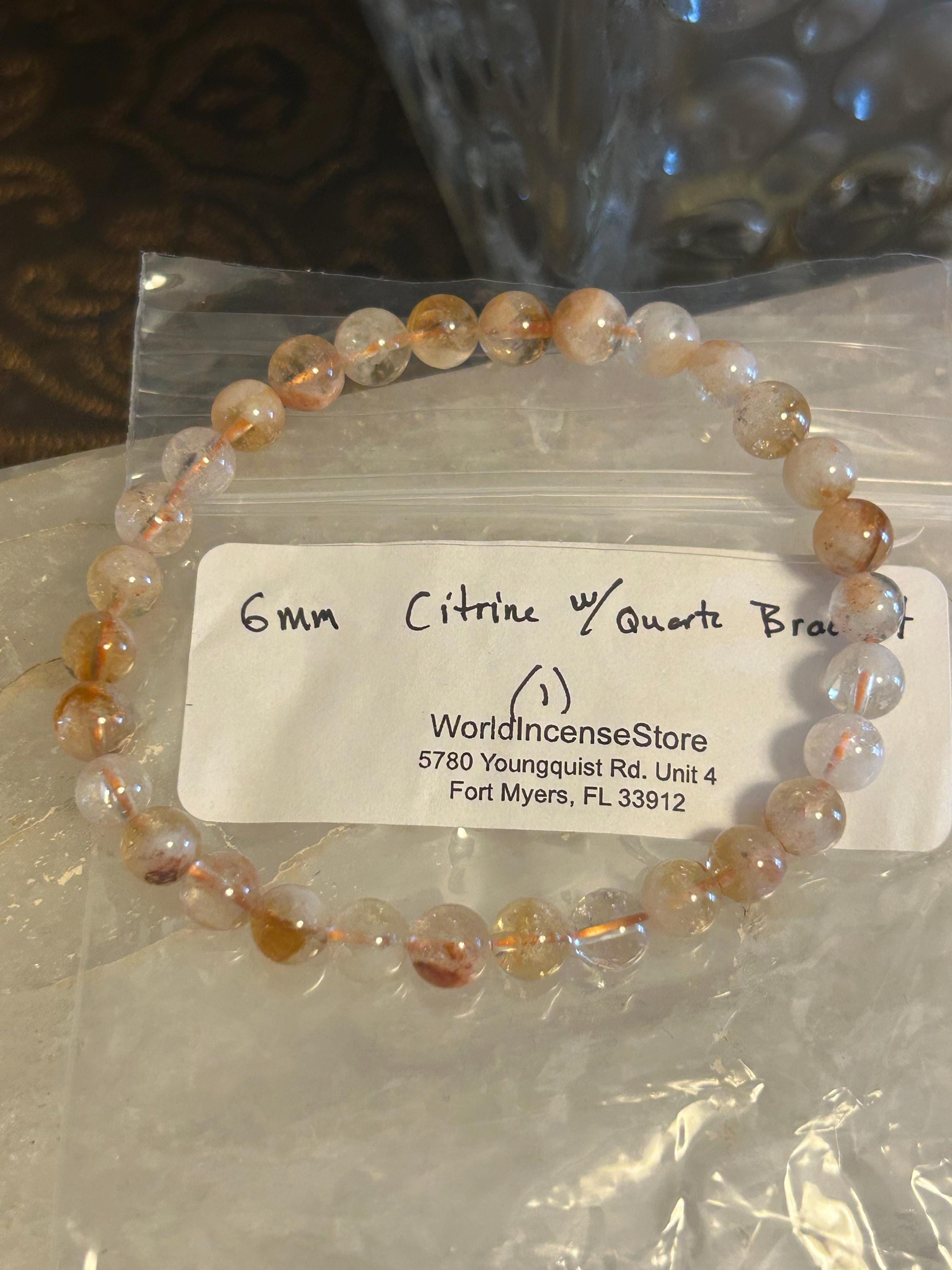 A beautiful bracelet crafted from Citrine with Quartz inclusions beads. 6 mm or 8 mm beads on a stretchable bracelet, fits most wrists. About 7.5" in size. Great for meditation, crystal healing, Reiki or simply wearing!
