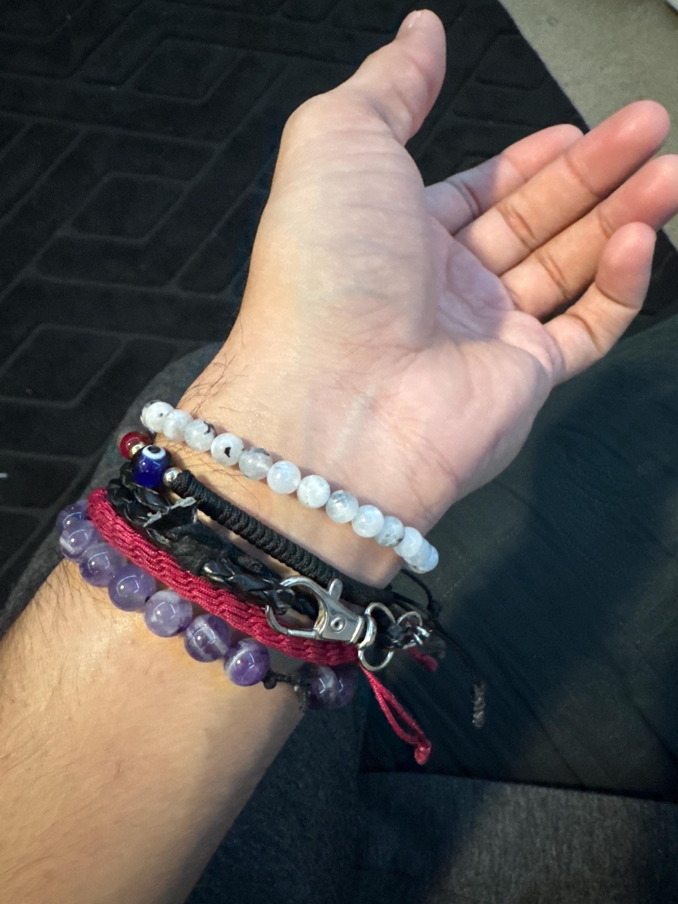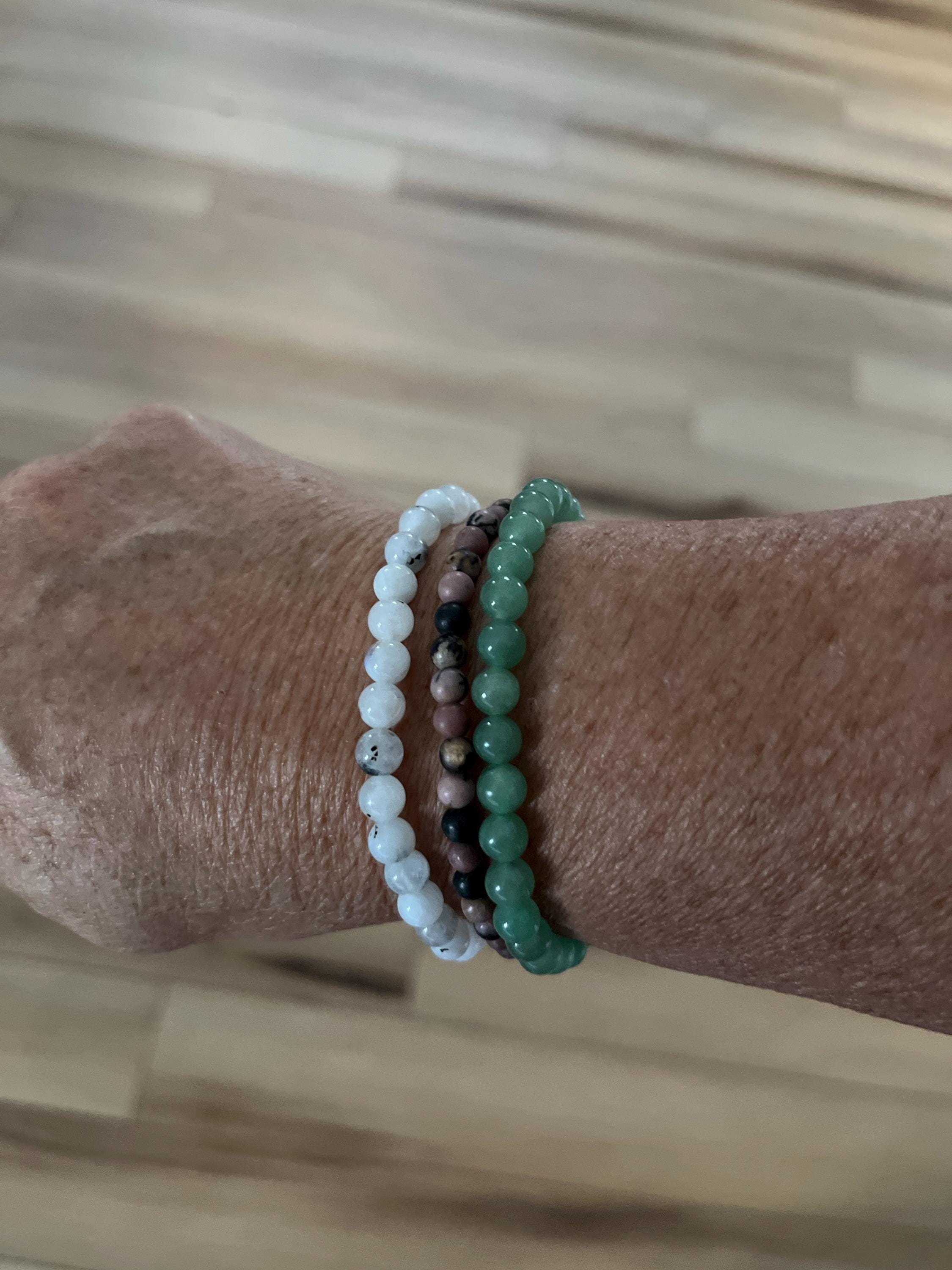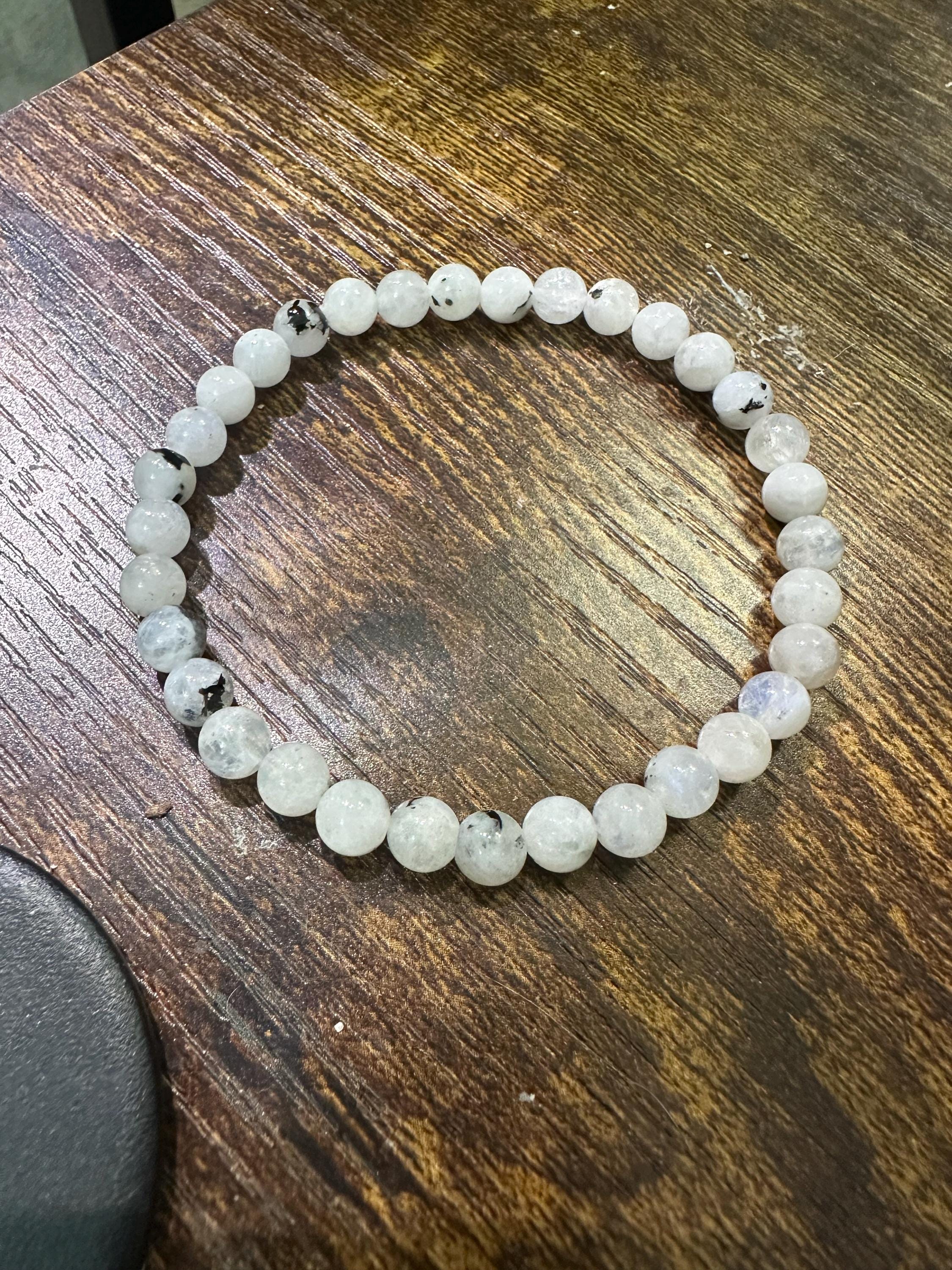 A beautiful bracelet crafted from Rainbow Moonstone beads. 6 mm or 8 mm beads on a stretchable bracelet, fits most wrists. About 7.5" in size. Great for meditation, crystal healing, Reiki or simply wearing! Each bracelet is completely unique. June Birthstone.