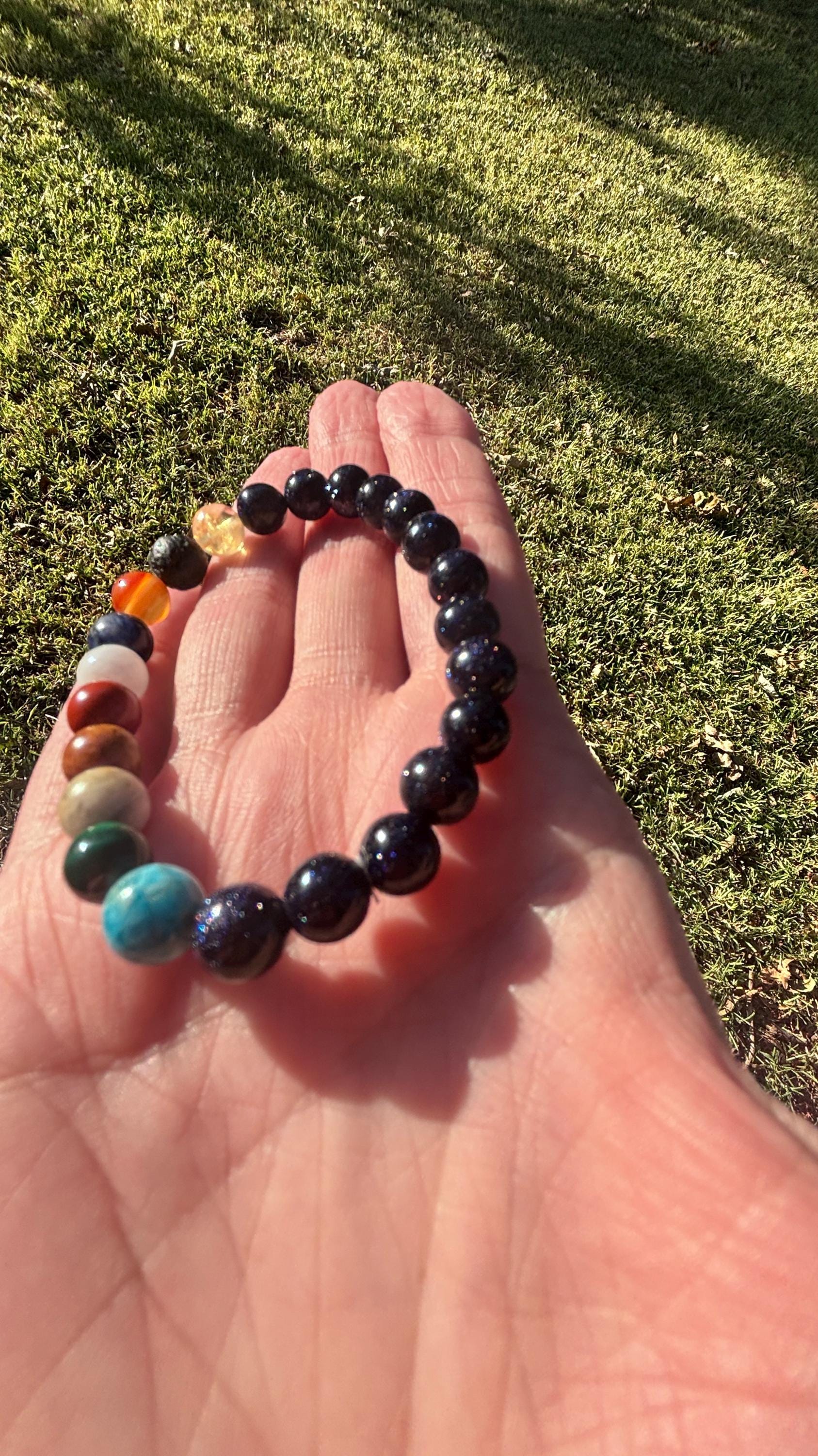 A beautiful bracelet hand crafted from 10 different beads representing the 8 Planets, the Sun and Moon along with Blue Goldstone representing the Stars. These are real genuine Gemstones hand picked for there Metaphysical Energy and beauty. Some of our most popular Crystal Beads combined into a unique Bracelet 8 mm thick beads on a stretchable bracelet, fits most wrists. About 7.5" in size.