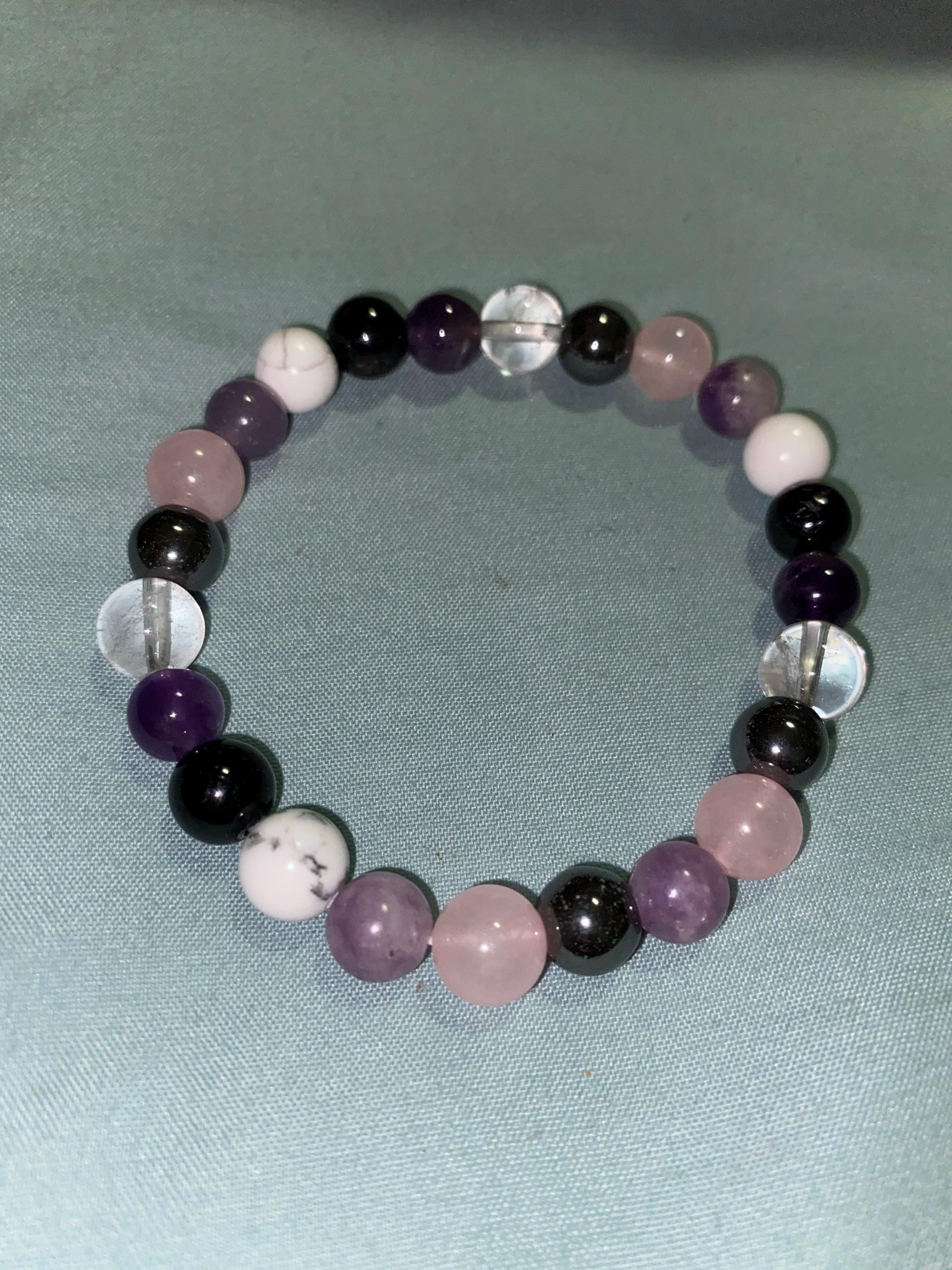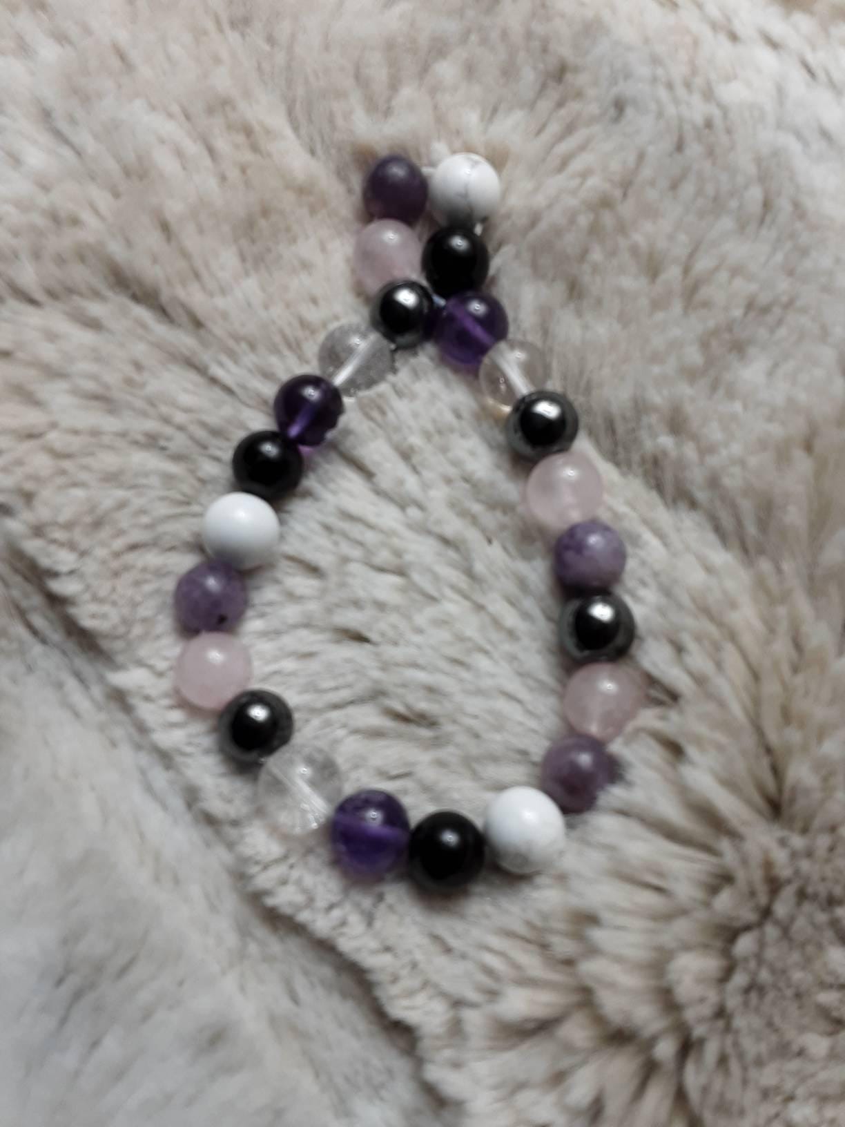 A beautiful bracelet hand crafted from Amethyst, Black Tourmaline, Clear Quartz, Hematite, Lepidolite, Rose Quartz & White Howlite beads. 8 mm thick beads on a stretchable bracelet, fits most wrists. About 7.5" in size. This carefully selected combination of Seven powerful protection crystals may help assist in reducing stress and providing mental balance.