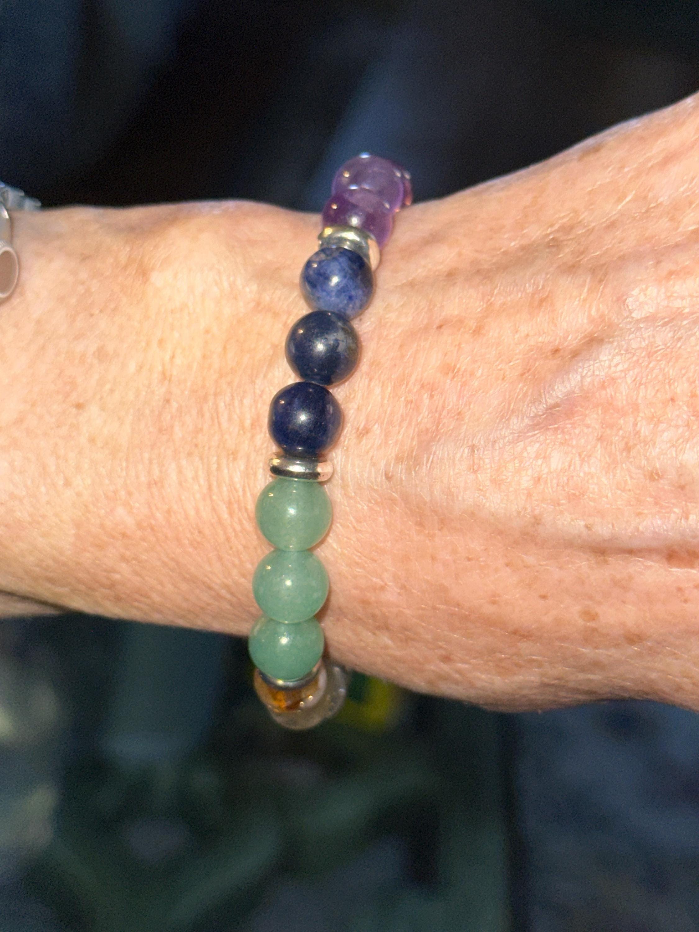Beautiful 7 Chakra bracelet handmade from 8 mm round Gemstones. This bracelet contains the following Crystals; Amethyst, Clear Quartz, Red Jasper, Carnelian, Citrine, Green Aventurine & Sodalite making up the 7 Chakras. There is 3 beads of each gemstone separated by stainless steel spacers. Easy to wear and take off, each bracelet is around 7.25"