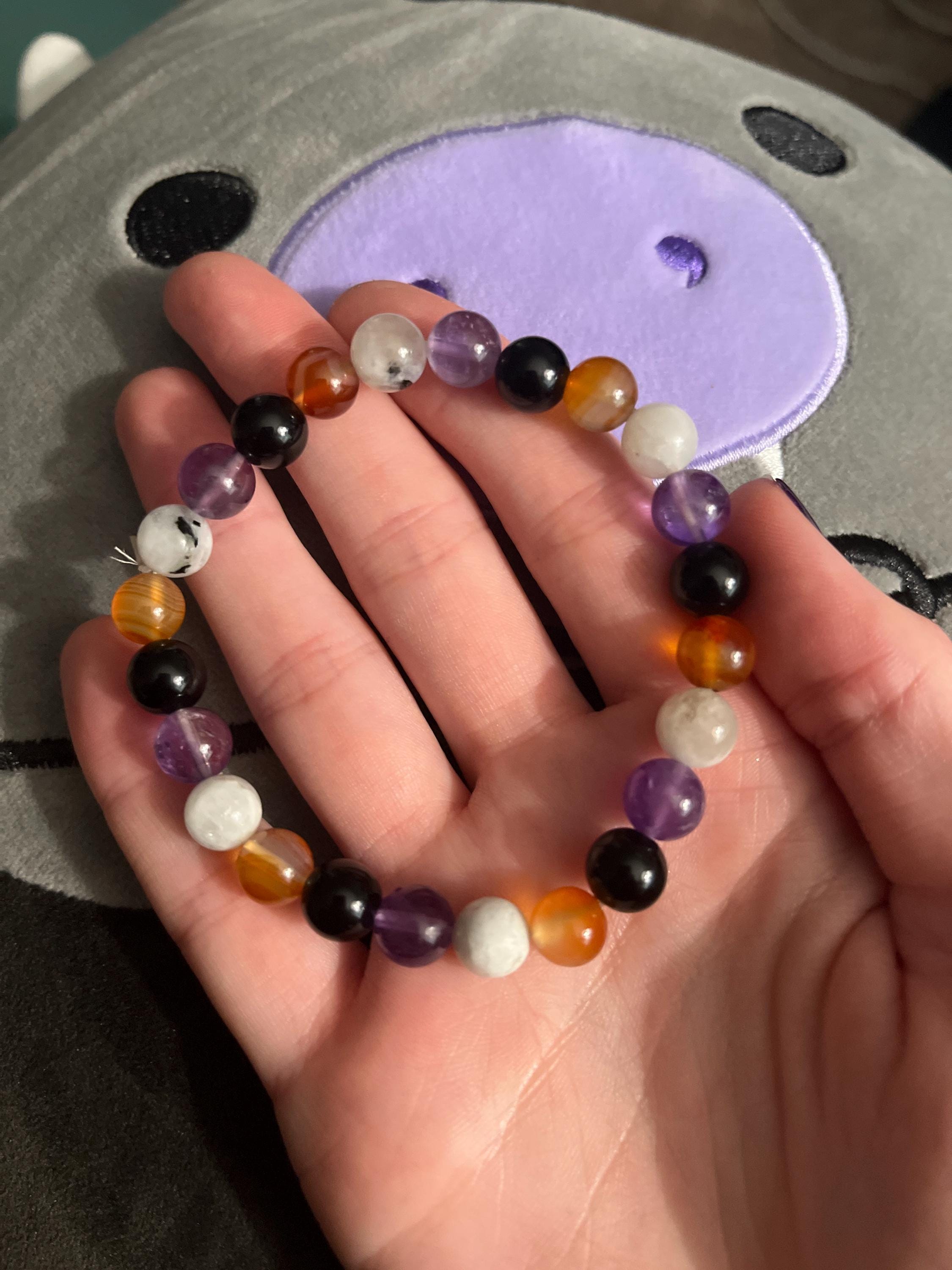 A beautiful bracelet hand crafted from Amethyst, Carnelian, Black Obsidian and Rainbow Moonstone 8 mm Beads. This carefully selected combination of four Spooky colored crystals is a great addition to any Halloween lovers collection. Four powerful Gemstones provide a plethora metaphysical qualities.