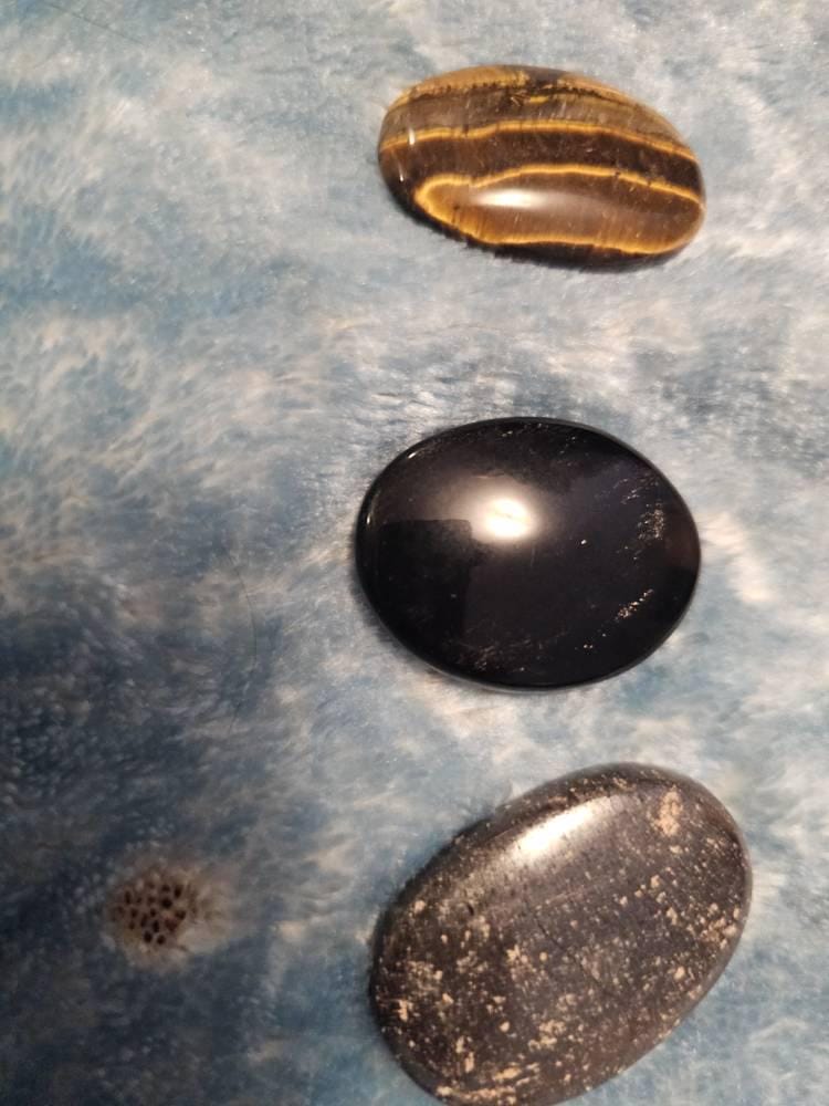 Triple Protection Worry Stone Set of three powerful protection Crystals shaped into perfect pocket sized Worry Stones. Size is around 1.5 - 1.75" +/- a great size to hold in your palm or keep in your pocket as needed. This kit comes with a velour pouch to carry and store the stones.
