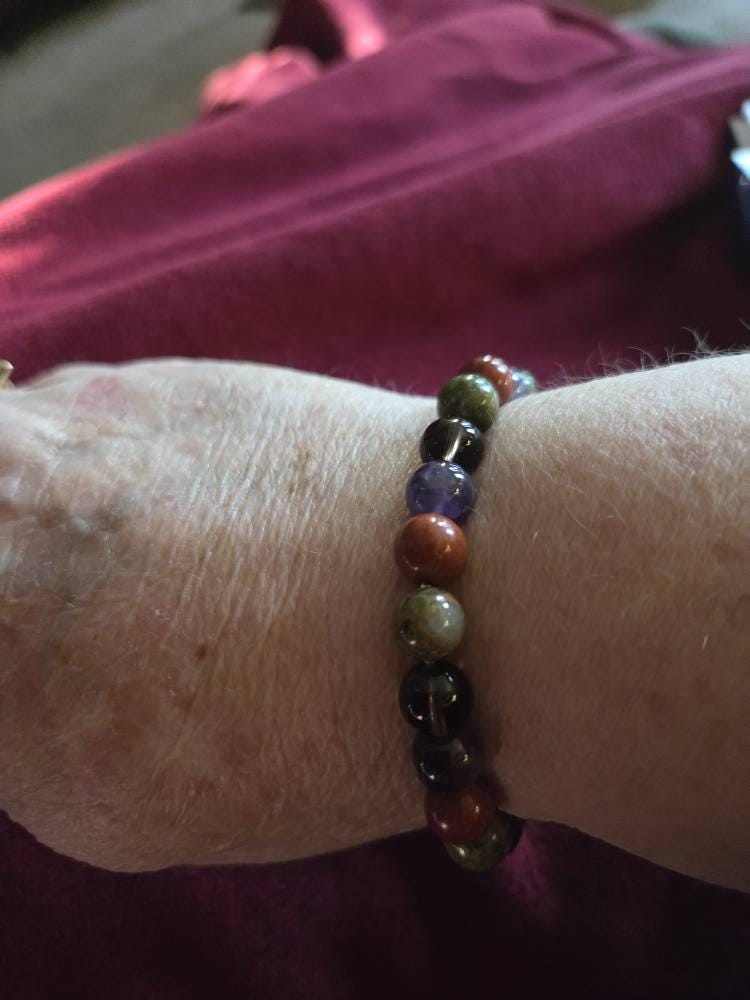 Carefully selected Crystal Beads associated with the Scorpio Zodiac Sign. These handmade beautiful bracelets are made with Amethyst, Red Jasper, Smoky Quartz and Unakite beads. 8 mm thick beads on a stretchable bracelet, fits most wrists. About 7.5" in size. Here's a little bit about each Gemstone -