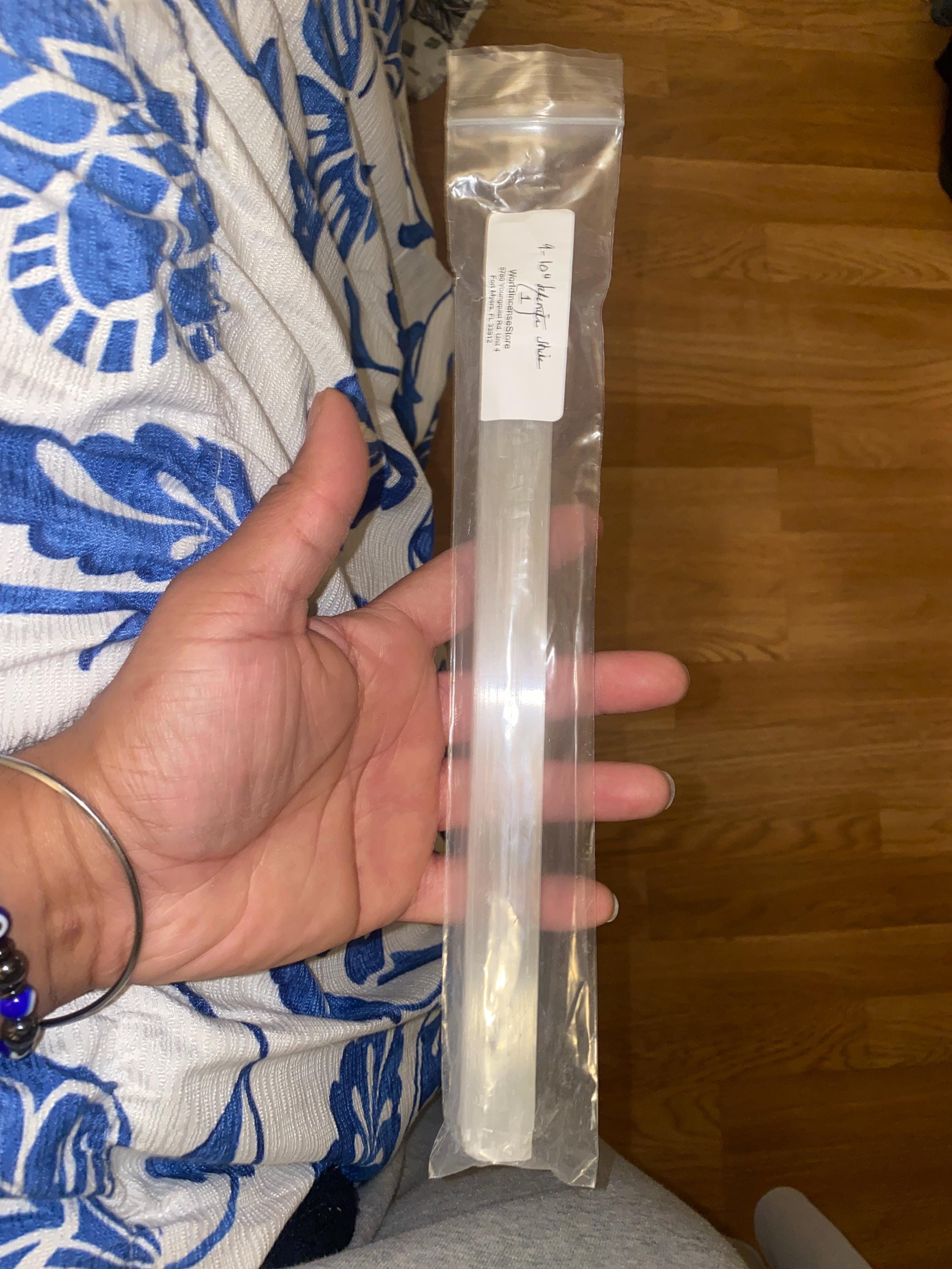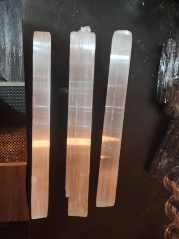 As this is a natural item please allow for slight variance +/- especially width. Selenite scratches, chips, dents, and fractures very easily. Due to its soft nature, please expect all Selenite products to have some minor 'imperfections'. As such you may notice some loose particles in the wrapping / shipping box - this is quite normal.