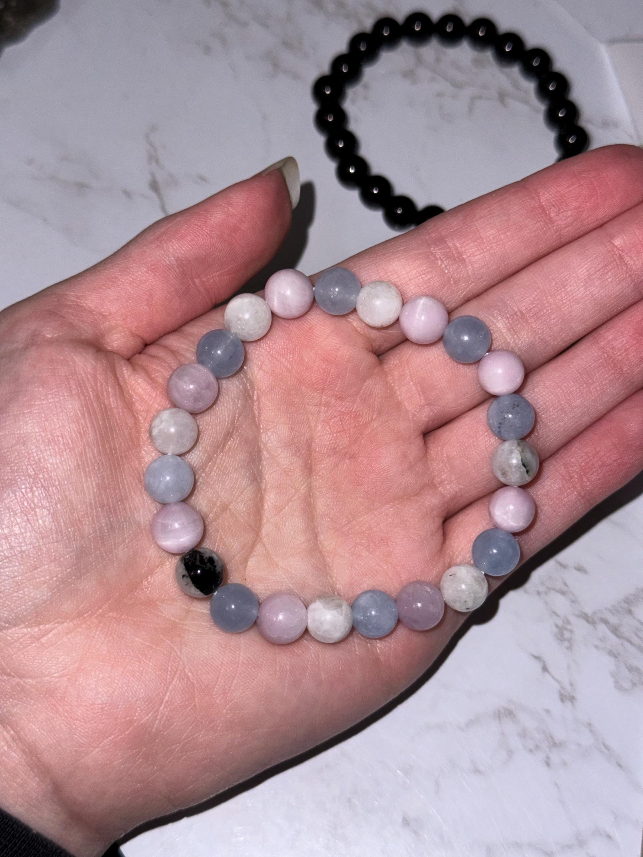 A beautiful bracelet hand crafted from Aquamarine, Kunzite and Rainbow Moonstone beads. 8 mm thick beads on a stretchable bracelet, fits most wrists. About 7.5" in size. This carefully selected combination of three powerful Meditative crystals will assist in mental clarity, mindfulness, and stability.