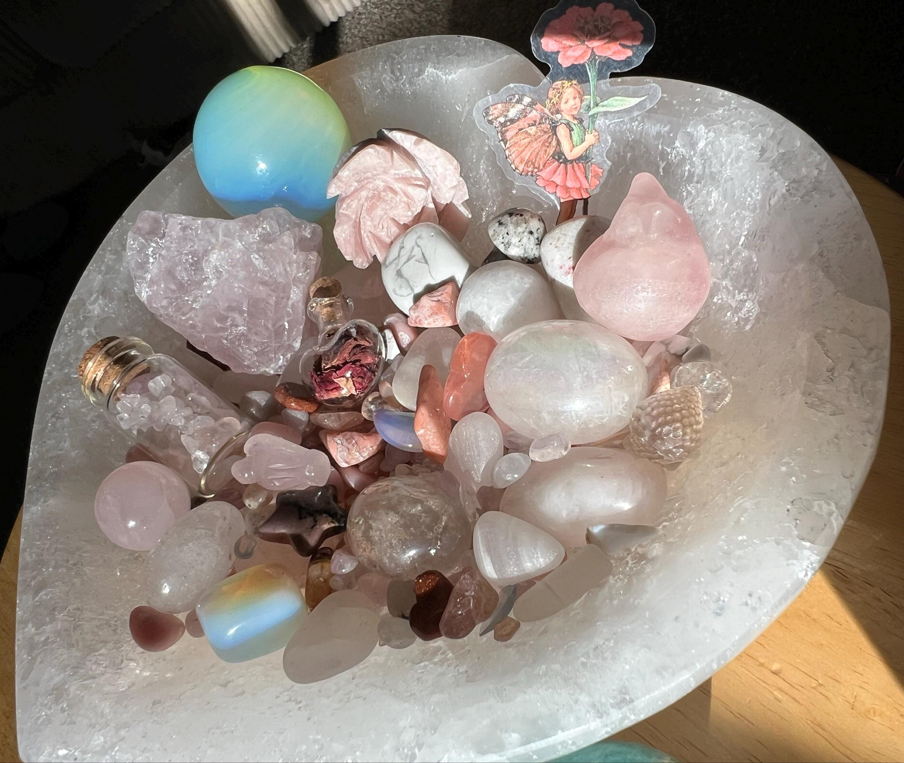 One Huge Heart shaped charging bowl carved from white selenite. This beautiful bowl is perfect for charging and cleansing your crystals and will also sit perfectly on a nightstand, sacred space or an altar to hold salt or herbs, etc - or simply as a beautiful piece to look at and enjoy! Great for use in reiki and healing. Bowl is about 8" in diameter (+/-) and is more than deep enough to hold lots of items. Beautiful display bowl.