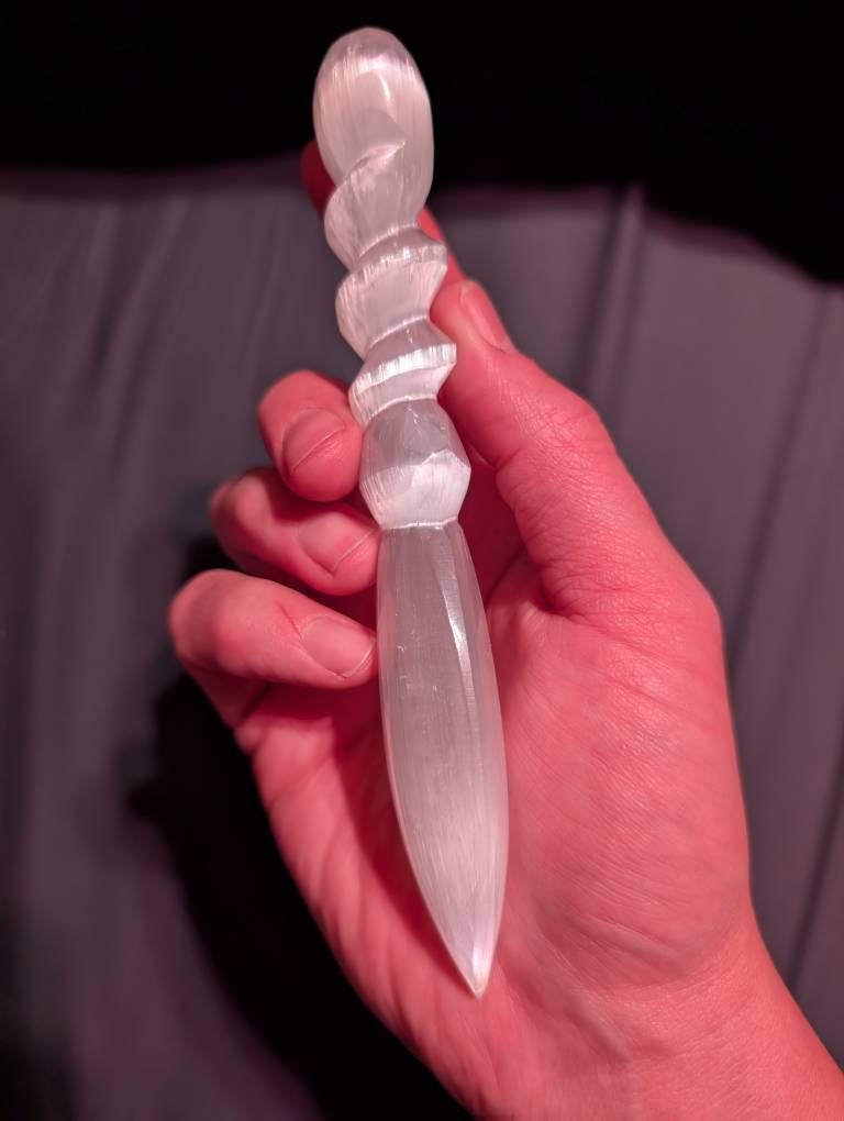 This is a very solid and lovely little athame. I really like the design combination of dagger and wand, it's not too much of either, and will work well for rituals and as decor. It feels soothingly cool and smooth in my hand, I like how it is pointed and the little natural variations of the selenite.