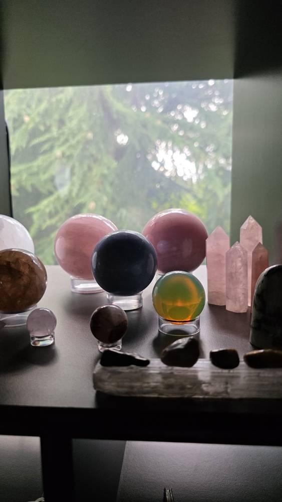 Opalite Crystal Sphere's size 1.5" +/-. Each Sphere comes with a small plastic stand measuring 0.25" across.