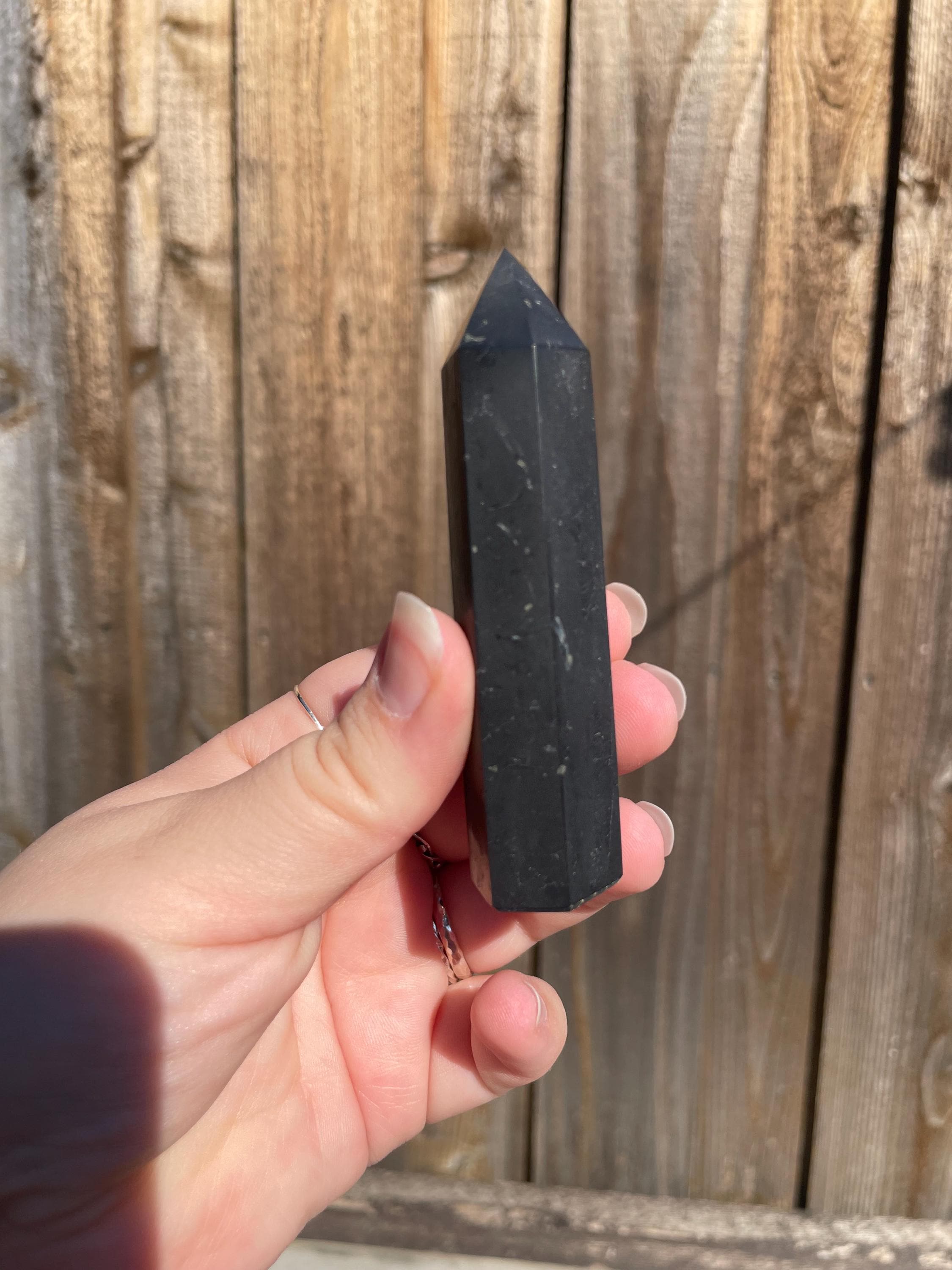 These beautiful Shungite Obelisks are wonderful home decor crystals full of Energy! 6-Sided Towers measuring 3 - 4" Tall +/-.