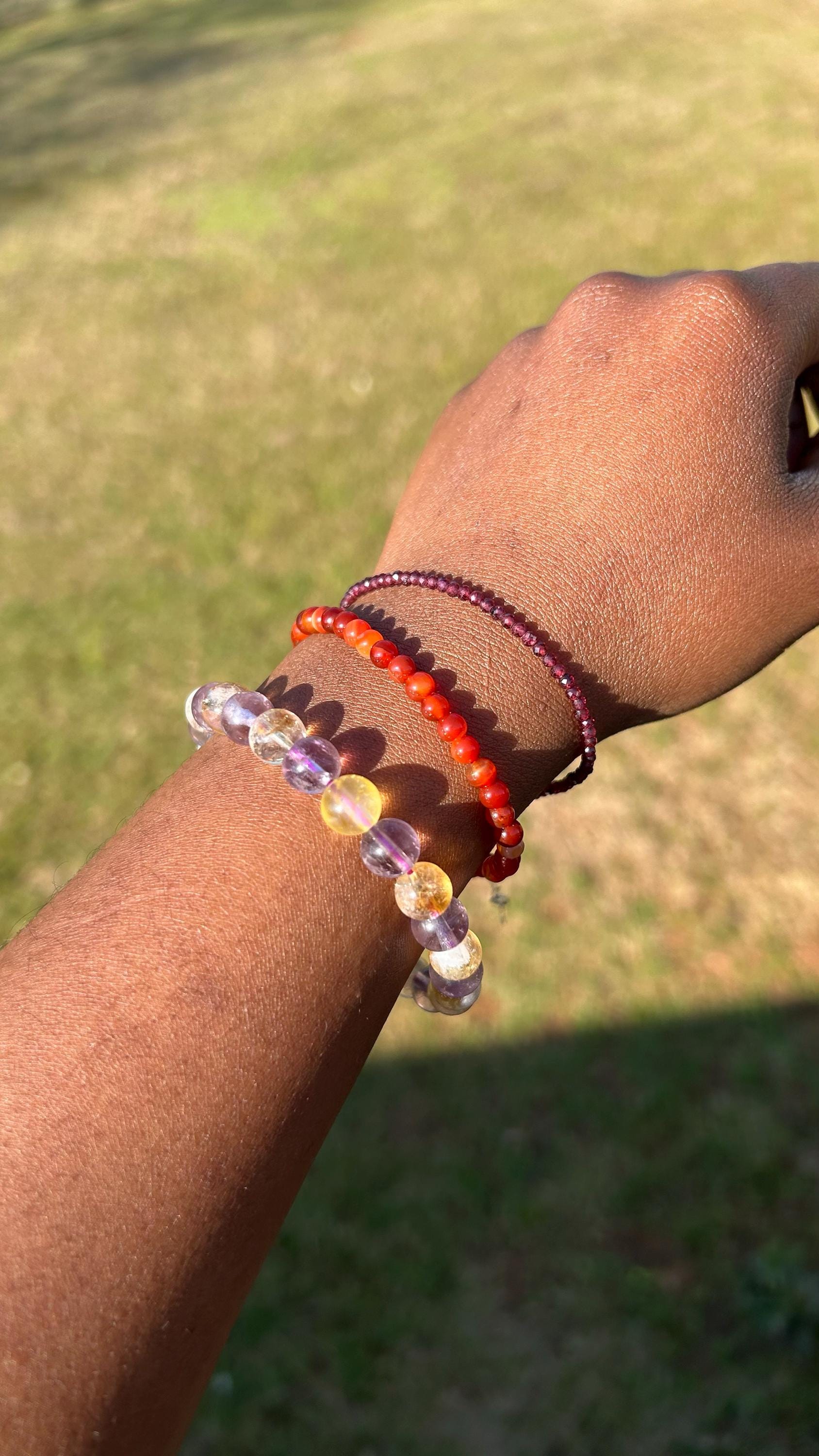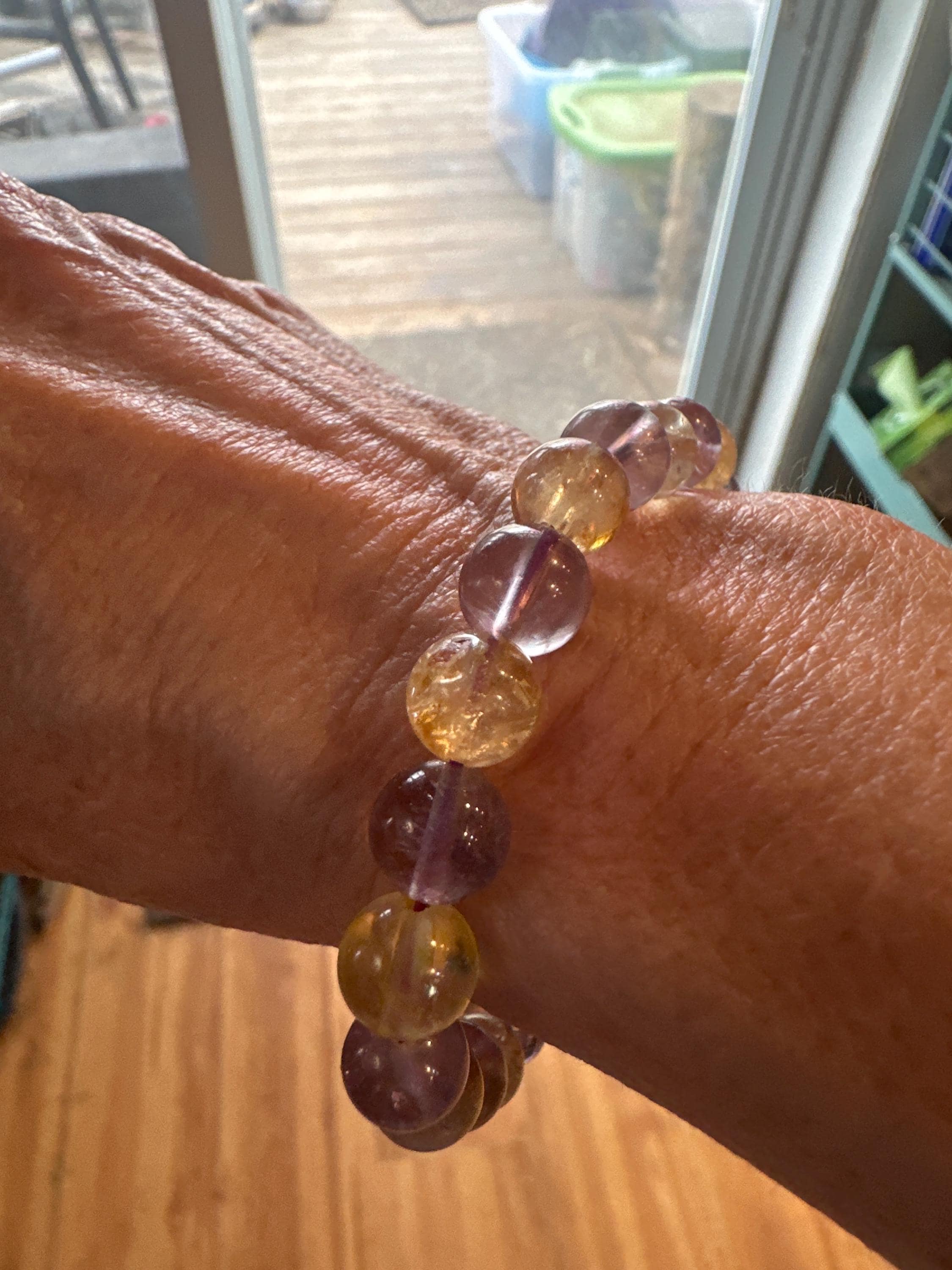 A beautiful bracelet crafted from Amethyst and Citrine beads. 8 mm beads on a stretchable bracelet, fits most wrists. About 7.5" in size. Great for meditation, crystal healing, Reiki or simply wearing! Each bracelet comes split with Amethyst and Citrine beads alternating.
