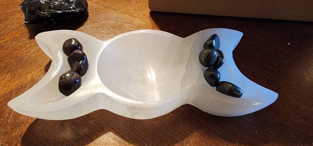 These Triple Moon Shape Selenite Bowls are perfect for charging and cleansing your crystals. It will sit perfectly on a nightstand, sacred space or an altar to hold, crystals, jewelry, salt, herbs etc - or simply as a beautiful piece to look at and enjoy! Great for use in Reiki and Crystal Healing.