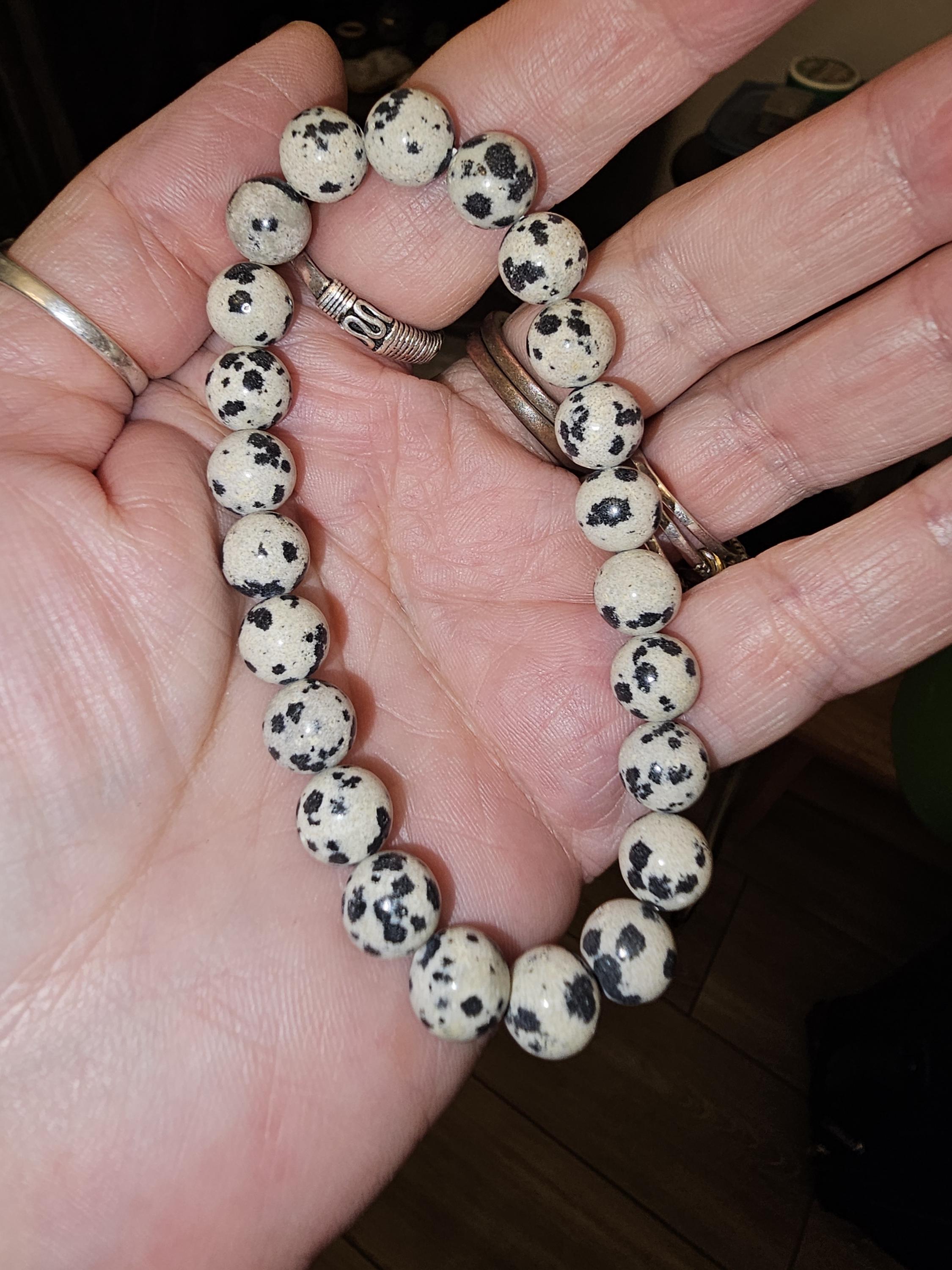 So happy with this 8mm Dalmatian Jasper bracelet. My dog broke mine that I had and I was so sad. But happy I found this replacement. Fast shipping. I love this bracelet. Thank you.