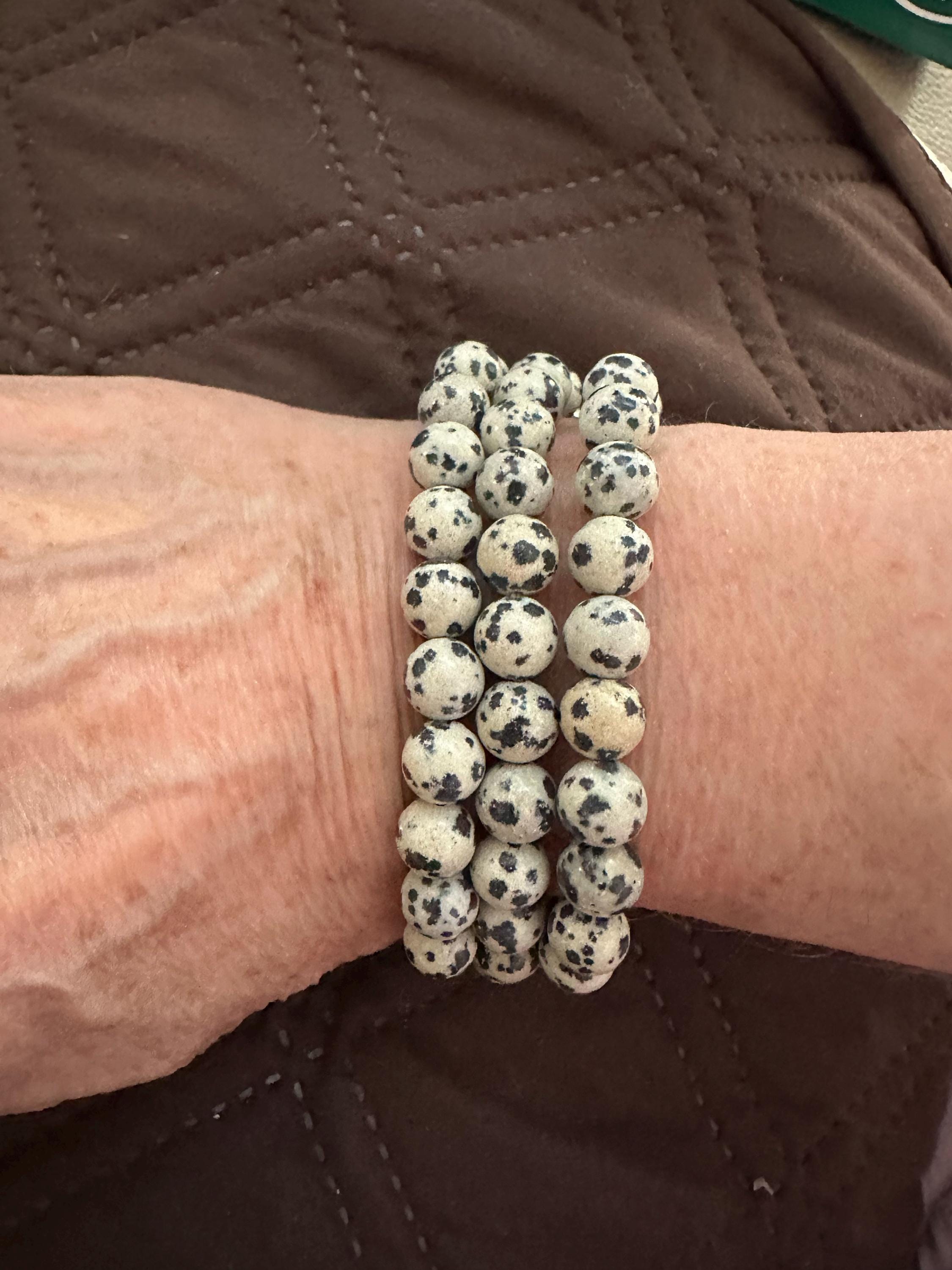 A beautiful bracelet crafted from 8 mm Dalmatian Jasper Beads. 8 mm thick beads on a stretchable bracelet, fits most wrists. About 7.5" in size. Great for meditation, crystal healing, Reiki or simply wearing!