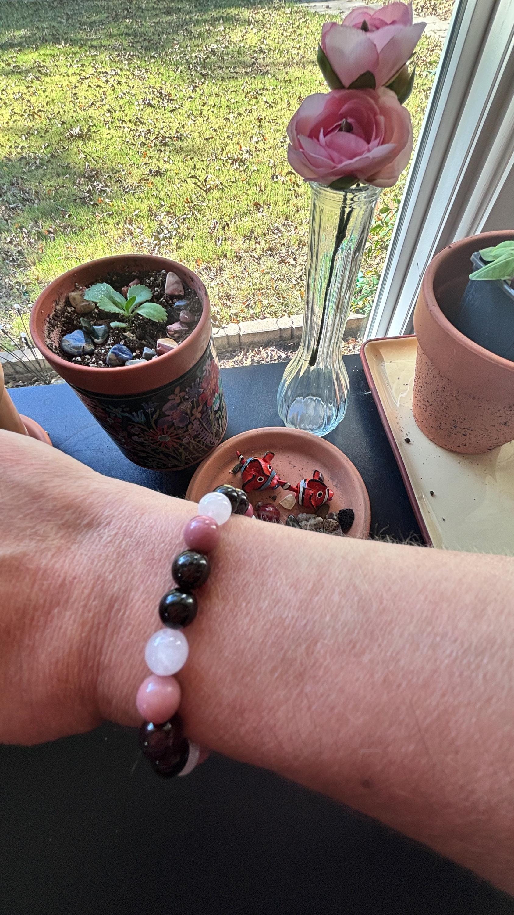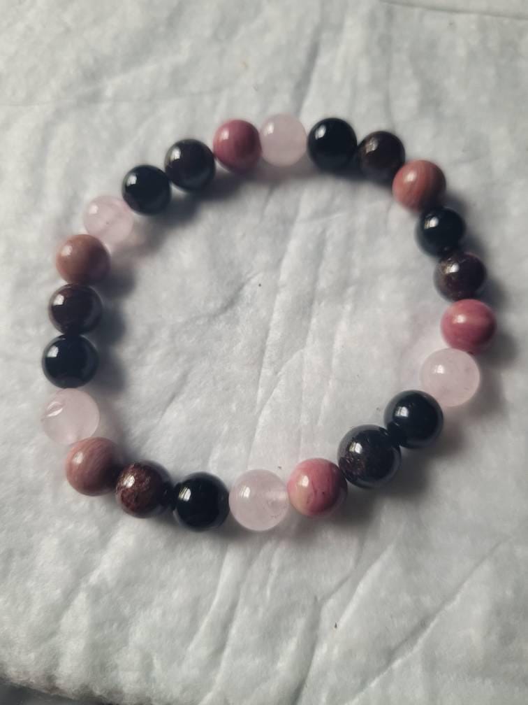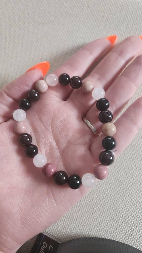 A beautiful bracelet hand crafted from Rose Quartz, Garnet, Rhodonite and Black Tourmaline beads. This carefully selected combination of four powerful Love & Protection crystals may assist in bringing compassion, warmth and sanctuary into ones life. 8 mm thick beads on a stretchable bracelet, fits most wrists. About 7.5" in size.